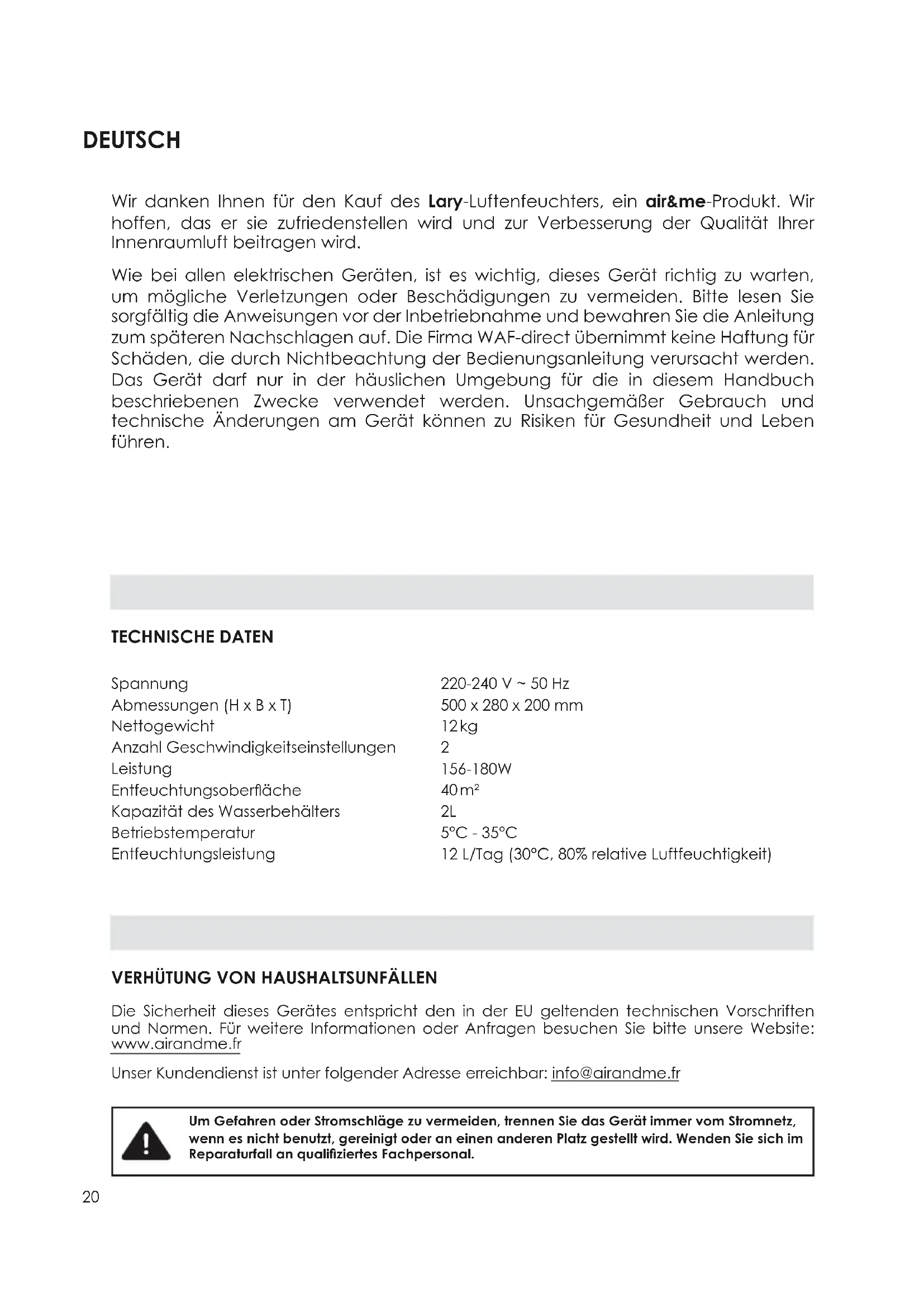 www.airandme.fr/en 18FAQ Circumstance Reason Solution The product does not work > The product is not correctly plug or there is an electrical problem. > Plug the socket correctly and check the voltage and the good functioning of your electrical system. Avoid multi sockets. > There is a problem on the electrical system of your house. > The tank is full. > Empty the tank. > The tank is not properly placed. > Push and place the tank properly. Drop in the appliance performance (less water in the tank) > The pre-lter is dirty what obstructs the air ow. > Clean the pre-lter. > The air inlet or outlet is obstructed by something. > Leave at least 20cm behind, around and in front of the appliance. > Temperature is too low. > Below 15°C the product works in Defrost Mode. It cannot therefore dehumidify to a maximum of its capacity. > Humidity rate is already low. Abnormal noise > Something obstructs the fan. > Make sure that no object obstructs the air ow. > The product has a functioning problem. > Contact your reseller for service support. E2 display > Hygrometry sensor problem. > Contact your reseller for service support. LO display > The ambient humidity is less than 35%. The device stops for safety. > Increase the room humidity rate with an air humidier (www. airandme.fr/en/air-humidier). HI display > The ambient humidity level is greater than 95%. The device stops for safety. CL display > The ambient temperature is below 5°C. The device stops for safety. > Increase the room temperature with a space heater (www. airandme.fr/en/fan-heater-air). CH display > The ambient temperature is above 35°C. The device stops for safety. 19Wir danken Ihnen für den Kauf des Lary-Luftenfeuchters, ein air&me-Produkt. Wir hoffen, das er sie zufriedenstellen wird und zur Verbesserung der Qualität Ihrer Innenraumluft beitragen wird. Wie bei allen elektrischen Geräten, ist es wichtig, dieses Gerät richtig zu warten, um mögliche Verletzungen oder Beschädigungen zu vermeiden. Bitte lesen Sie sorgfältig die Anweisungen vor der Inbetriebnahme und bewahren Sie die Anleitung zum späteren Nachschlagen auf. Die Firma WAF-direct übernimmt keine Haftung für Schäden, die durch Nichtbeachtung der Bedienungsanleitung verursacht werden. Das Gerät darf nur in der häuslichen Umgebung für die in diesem Handbuch beschriebenen Zwecke verwendet werden. Unsachgemäßer Gebrauch und technische Änderungen am Gerät können zu Risiken für Gesundheit und Leben führen. DEUTSCH Spannung Abmessungen (H x B x T) Nettogewicht Anzahl Geschwindigkeitseinstellungen Leistung Entfeuchtungsoberäche Kapazität des Wasserbehälters Betriebstemperatur Entfeuchtungsleistung 220-240 V ~ 50 Hz 500 x 280 x 200 mm 12 kg