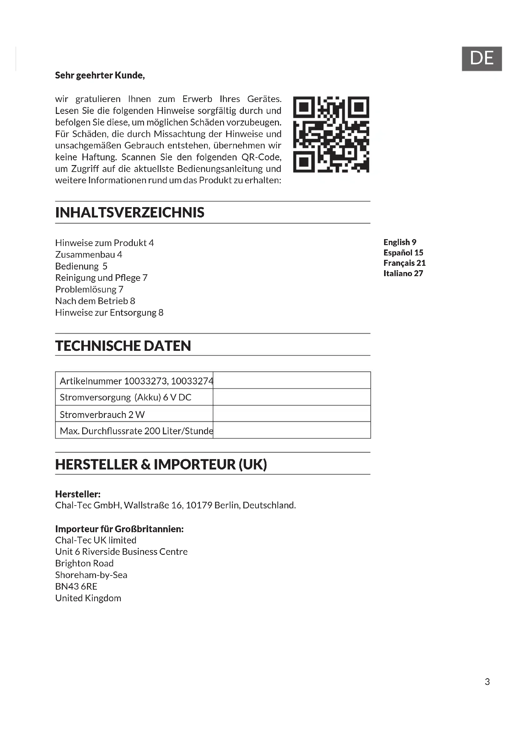 Sehr geehrter Kunde, wir gratulieren Ihnen zum Erwerb Ihres Gerätes. Lesen Sie die folgenden Hinweise sorgfältig durch und befolgen Sie diese, um möglichen Schäden vorzubeugen. Für Schäden, die durch Missachtung der Hinweise und unsachgemäßen Gebrauch entstehen, übernehmen wir keine Haftung. Scannen Sie den folgenden QR-Code, um Zugriff auf die aktuellste Bedienungsanleitung und weitere Informationen rund um das Produkt zu erhalten: INHALTSVERZEICHNIS Hinweise zum Produkt 4 Zusammenbau 4 Bedienung 5 Reinigung und Pege 7 Problemlösung 7 Nach dem Betrieb 8 Hinweise zur Entsorgung 8 TECHNISCHE DATEN Artikelnummer 10033273, 10033274 Stromversorgung (Akku) 6 V DC Stromverbrauch 2 W Max. Durchussrate 200 Liter/Stunde HERSTELLER & IMPORTEUR (UK) Hersteller: Chal-Tec GmbH, Wallstraße 16, 10179 Berlin, Deutschland. Importeur für Großbritannien: Chal-Tec UK limited Unit 6 Riverside Business Centre Brighton Road Shoreham-by-Sea BN43 6RE United Kingdom English 9 Español 15 Français 21 Italiano 274