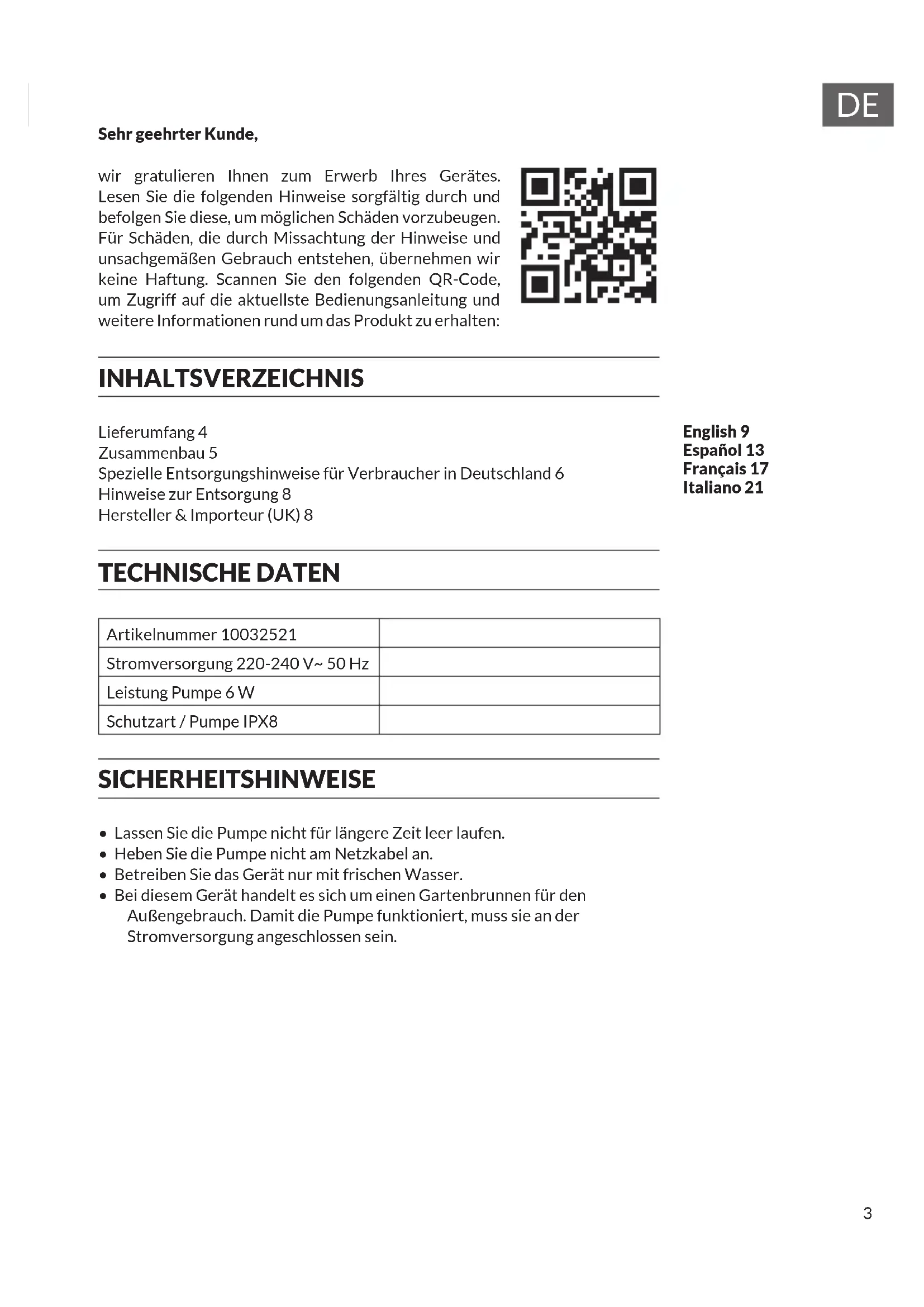 wir gratulieren Ihnen zum Erwerb Ihr's Gerätes. Lesen Sie die folgenden Hinweise sorgfältig durch und befolgen Sie diese, um möglichen Schäden vorzubeugen. Für Schäden, die durch Missachtung der Hinweise und unsachgemäßigen Gebrauch entstehen, übernehmen wir keine Haftung. Scannen Sie den folgenden QR-Code, um Zugriff auf die aktuellste Bedienungsanleitung und weitere Informationen rund um das Produkt zu erhalten: