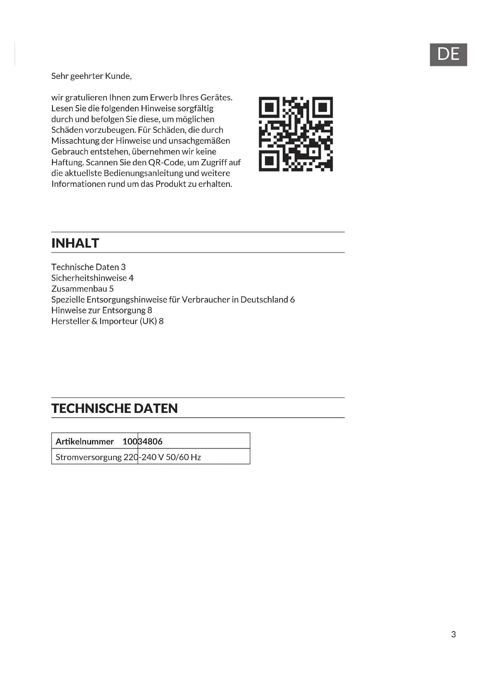 Sehr geehrter Kunde, wir gratulieren Ihnen zum Erwerb Ihres Gerätes. Lesen Sie die folgenden Hinweise sorgfältig durch und befolgen Sie diese, um möglichen Schäden vorzubeugen. Für Schäden, die durch Missachtung der Hinweise und unsachgemäßen Gebrauch entstehen, übernehmen wir keine Haftung. Scannen Sie den QR-Code, um Zugriff auf die aktuellste Bedienungsanleitung und weitere Informationen rund um das Produkt zu erhalten. INHALT Technische Daten 3 Sicherheitshinweise 4 Zusammenbau 5 Spezielle Entsorgungshinweise für Verbraucher in Deutschland 6 Hinweise zur Entsorgung 8 Hersteller & Importeur (UK) 8 TECHNISCHE DATEN Arkelnummer 10034806 Stromversorgung 220-240 V 50/60 Hz4