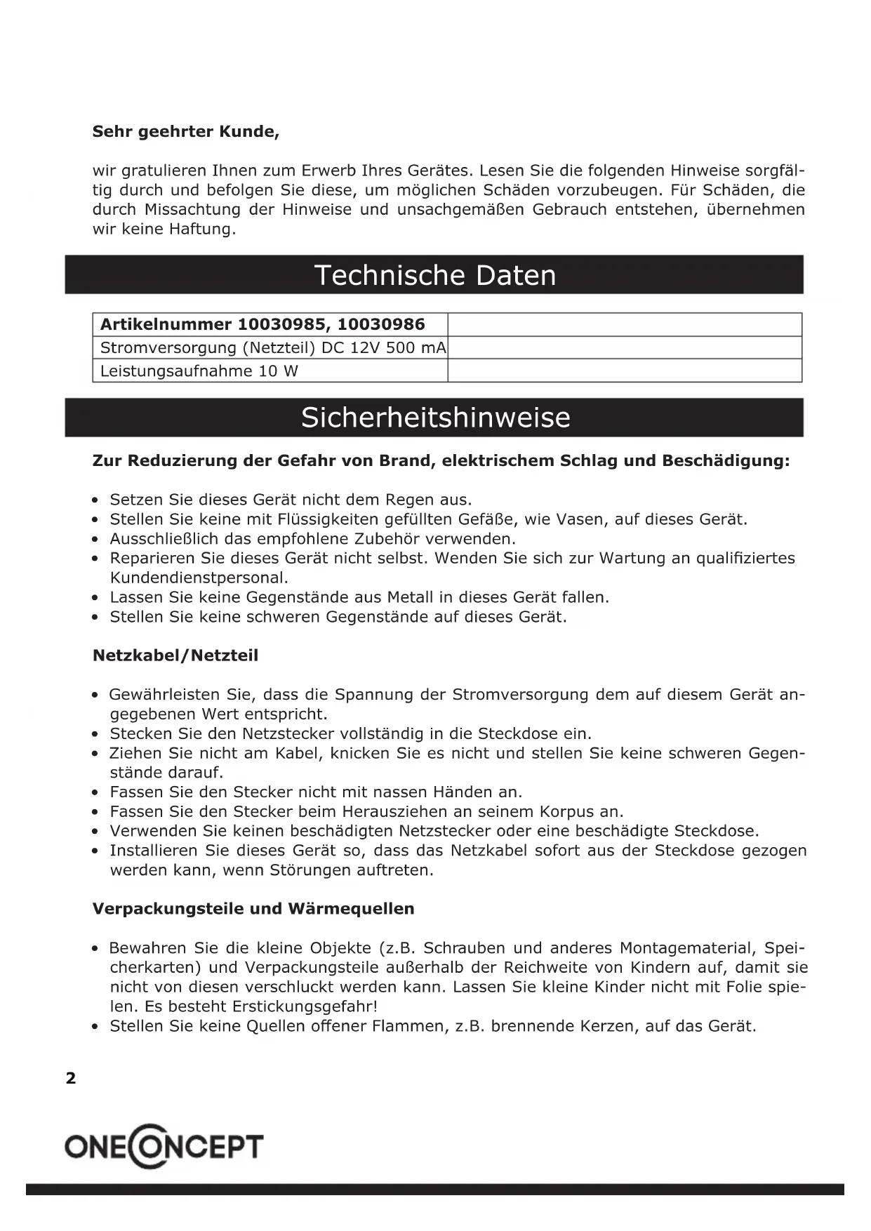 Sehr geehrter Kunde, wir gratulieren Ihnen zum Erwerb Ihres Gerätes. Lesen Sie die folgenden Hinweise sorgfäl- tig durch und befolgen Sie diese, um möglichen Schäden vorzubeugen. Für Schäden, die durch Missachtung der Hinweise und unsachgemäßen Gebrauch entstehen, übernehmen wir keine Haftung. Technische Daten Artikelnummer 10030985, 10030986 Stromversorgung (Netzteil) DC 12V 500 mA Leistungsaufnahme 10 W Sicherheitshinweise Zur Reduzierung der Gefahr von Brand, elektrischem Schlag und Beschädigung: