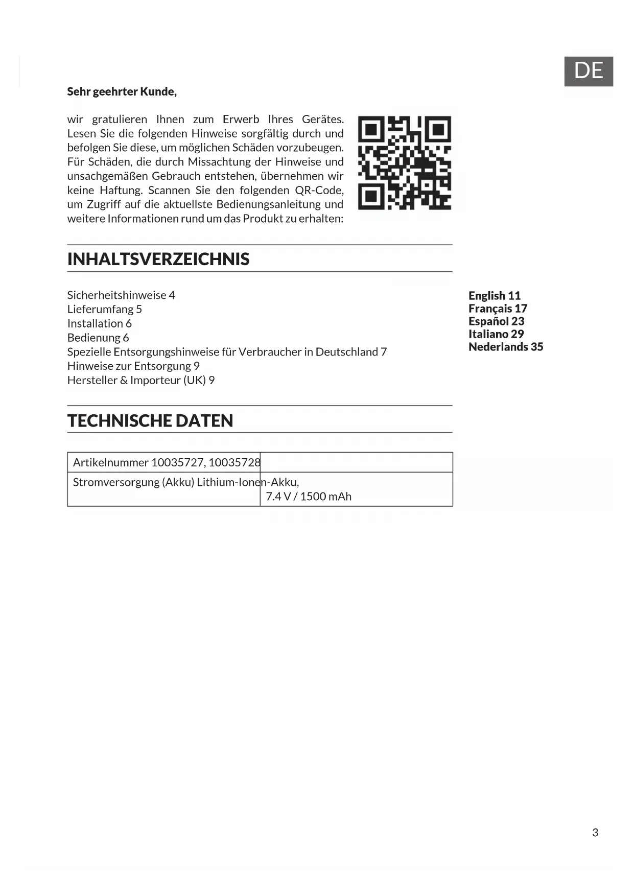 Sehr geehrter Kunde, wir gratulieren Ihnen zum Erwerb Ihres Gerätes. Lesen Sie die folgenden Hinweise sorgfältig durch und befolgen Sie diese, um möglichen Schäden vorzubeugen. Für Schäden, die durch Missachtung der Hinweise und unsachgemäßen Gebrauch entstehen, übernehmen wir keine Haftung. Scannen Sie den folgenden QR-Code, um Zugriff auf die aktuellste Bedienungsanleitung und weitere Informationen rund um das Produkt zu erhalten: INHALTSVERZEICHNIS Sicherheitshinweise 4 Lieferumfang 5 Installation 6 Bedienung 6 Spezielle Entsorgungshinweise für Verbraucher in Deutschland 7 Hinweise zur Entsorgung 9 Hersteller & Importeur (UK) 9 TECHNISCHE DATEN Artikelnummer 10035727, 10035728 Stromversorgung (Akku) Lithium-Ionen-Akku,