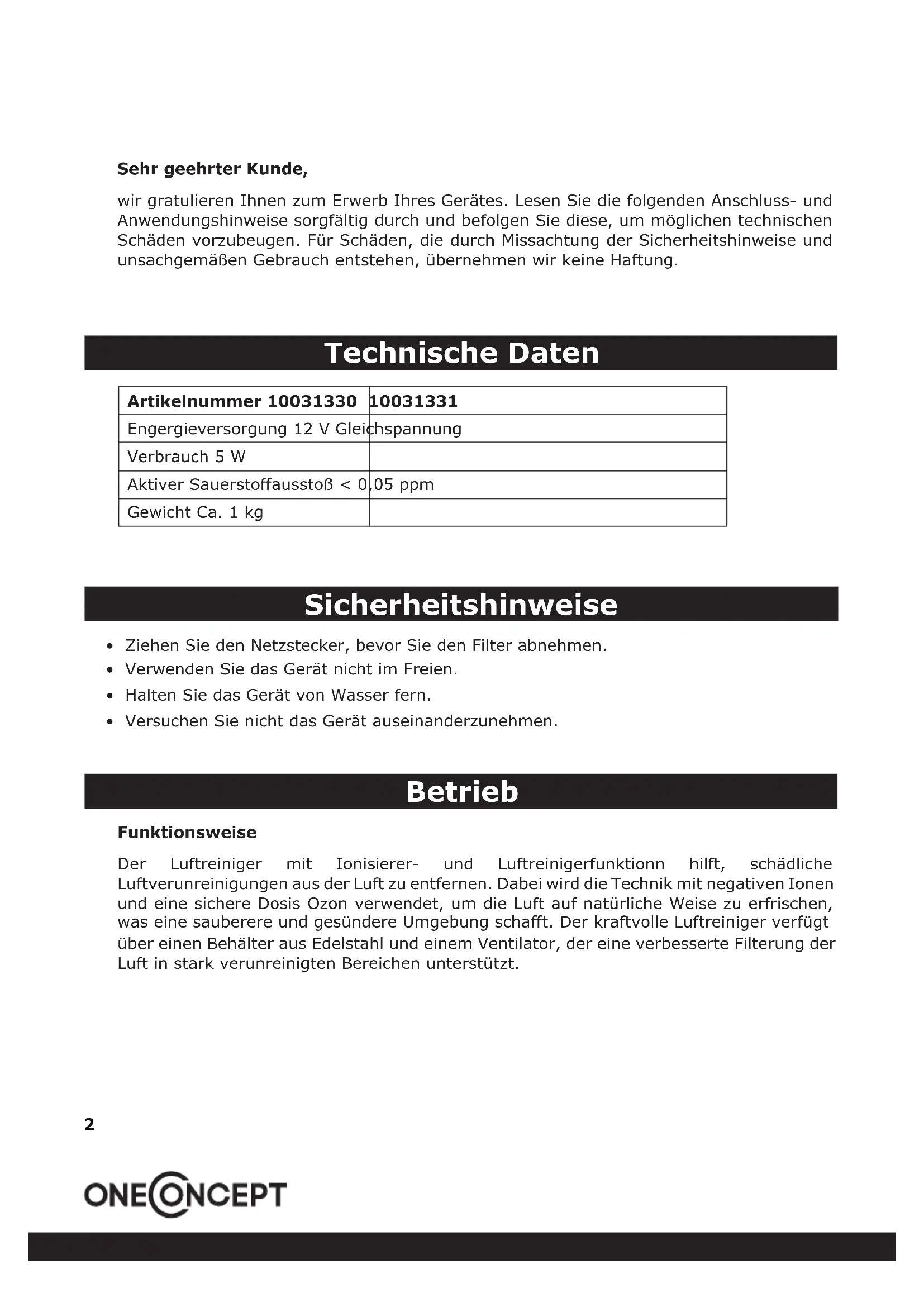 Sicherheitshinweise Betrieb Technische Daten Sehr geehrter Kunde, wir gratulieren Ihnen zum Erwerb Ihres Gerätes. Lesen Sie die folgenden Anschluss- und Anwendungshinweise sorgfältig durch und befolgen Sie diese, um möglichen technischen Schäden vorzubeugen. Für Schäden, die durch Missachtung der Sicherheitshinweise und unsachgemäßen Gebrauch entstehen, übernehmen wir keine Haftung. Artikelnummer 10031330 10031331 Engergieversorgung 12 V Gleichspannung Verbrauch 5 W Aktiver Sauerstoausstoß < 0,05 ppm Gewicht Ca. 1 kg