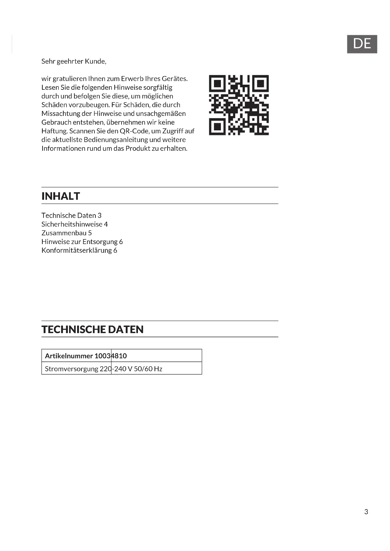 Sehr geehrter Kunde, wir gratulieren Ihnen zum Erwerb Ihres Gerätes. Lesen Sie die folgenden Hinweise sorgfältig durch und befolgen Sie diese, um möglichen Schäden vorzubeugen. Für Schäden, die durch Missachtung der Hinweise und unsachgemäßen Gebrauch entstehen, übernehmen wir keine Haftung. Scannen Sie den QR-Code, um Zugriff auf die aktuellste Bedienungsanleitung und weitere Informationen rund um das Produkt zu erhalten. INHALT Technische Daten 3 Sicherheitshinweise 4 Zusammenbau 5 Hinweise zur Entsorgung 6 Konformitätserklärung 6 TECHNISCHE DATEN Artikelnummer 10034810 Stromversorgung 220-240 V 50/60 Hz4