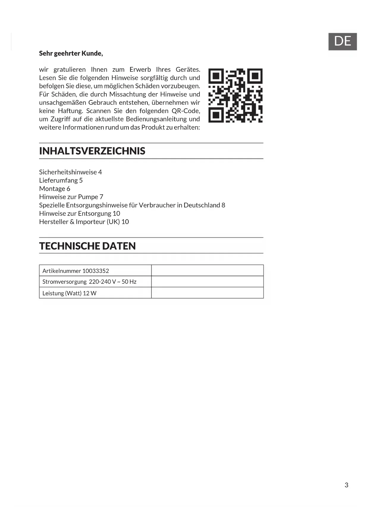 Sicherheitshinweise4 Lieferumfang5 Montage6 Hinweise zur Pumpe7 Spezielle Entsorgungshinweise für Verbraucher in Deutschland8 Hinweise zur Entsorgung10 Hersteller & Importeur (UK)10 Sehr geehrter Kunde, wir gratulieren Ihnen zum Erwerb Ihres Gerätes. Lesen Sie die folgenden Hinweise sorgfältig durch und befolgen Sie diese, um möglichen Schäden vorzubeugen. Für Schäden, die durch Missachtung der Hinweise und unsachgemäßen Gebrauch entstehen, übernehmen wir keine Haftung. Scannen Sie den folgenden QR-Code, um Zugriff auf die aktuellste Bedienungsanleitung und weitere Informationen rund um das Produkt zu erhalten: INHALTSVERZEICHNIS TECHNISCHE DATEN Artikelnummer 10033352 Stromversorgung 220-240 V ~ 50 Hz Leistung (Watt) 12 W4