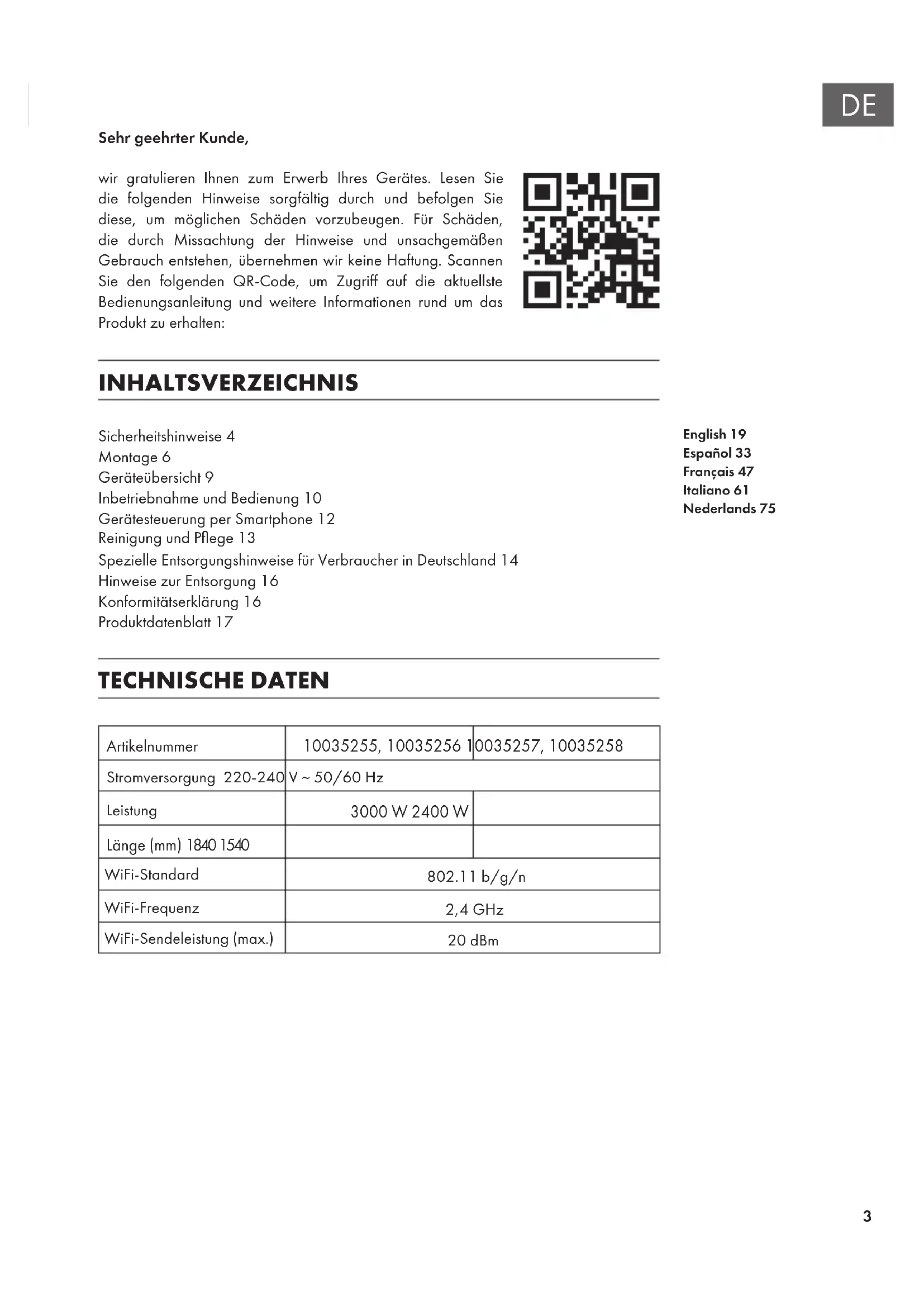 Sehr geehrter Kunde, wir gratulieren Ihnen zum Erwerb Ihres Gerätes. Lesen Sie die folgenden Hinweise sorgfältig durch und befolgen Sie diese, um möglichen Schäden vorzubeugen. Für Schäden, die durch Missachtung der Hinweise und unsachgemäßen Gebrauch entstehen, übernehmen wir keine Haftung. Scannen Sie den folgenden QR-Code, um Zugriff auf die aktuellste Bedienungsanleitung und weitere Informationen rund um das Produkt zu erhalten: INHALTSVERZEICHNIS Sicherheitshinweise 4 Montage 6 Geräteübersicht 9 Inbetriebnahme und Bedienung 10 Gerätesteuerung per Smartphone 12 Reinigung und Pege 13 Spezielle Entsorgungshinweise für Verbraucher in Deutschland 14 Hinweise zur Entsorgung 16 Konformitätserklärung 16 Produktdatenblatt 17 TECHNISCHE DATEN Artikelnummer 10035255, 10035256 10035257, 10035258 Stromversorgung 220-240 V ~ 50/60 Hz Leistung 3000 W 2400 W Länge (mm) 1840 1540 WiFi-Standard
