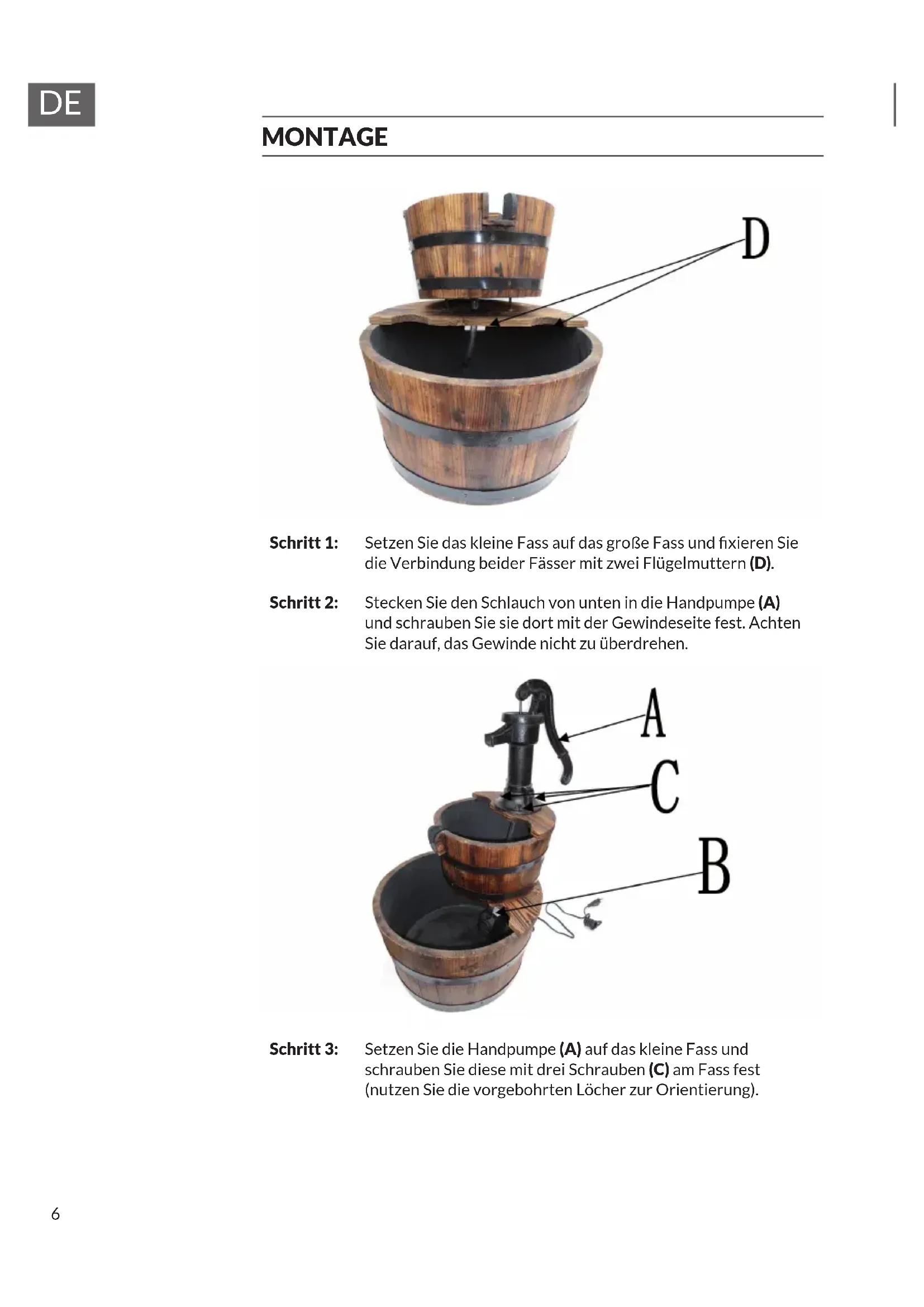 MONTAGE Schritt 1: Setzen Sie das kleine Fass auf das große Fass und xieren Sie die Verbindung beider Fässer mit zwei Flügelmuttern (D). Schritt 2: Stecken Sie den Schlauch von unten in die Handpumpe (A) und schrauben Sie sie dort mit der Gewindeseite fest. Achten Sie darauf, das Gewinde nicht zu überdrehen. Schritt 3: Setzen Sie die Handpumpe (A) auf das kleine Fass und schrauben Sie diese mit drei Schrauben (C) am Fass fest (nutzen Sie die vorgebohrten Löcher zur Orientierung).7