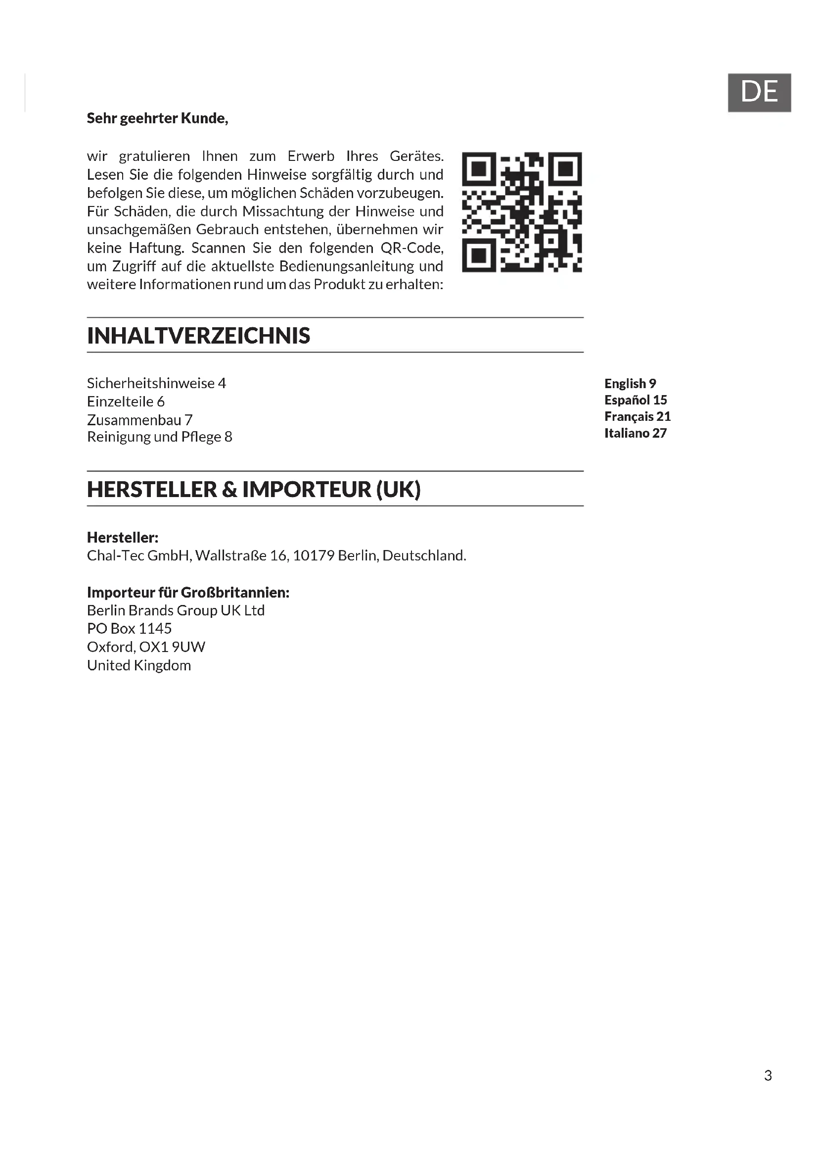 Sehr geehrter Kunde, wir gratulieren Ihnen zum Erwerb Ihres Gerätes. Lesen Sie die folgenden Hinweise sorgfältig durch und befolgen Sie diese, um möglichen Schäden vorzubeugen. Für Schäden, die durch Missachtung der Hinweise und unsachgemäßen Gebrauch entstehen, übernehmen wir keine Haftung. Scannen Sie den folgenden QR-Code, um Zugriff auf die aktuellste Bedienungsanleitung und weitere Informationen rund um das Produkt zu erhalten: INHALTVERZEICHNIS Sicherheitshinweise 4 Einzelteile 6 Zusammenbau 7 Reinigung und Pege 8 HERSTELLER & IMPORTEUR (UK) Hersteller: Chal-Tec GmbH, Wallstraße 16, 10179 Berlin, Deutschland. Importeur für Großbritannien: Berlin Brands Group UK Ltd PO Box 1145 Oxford, OX1 9UW United Kingdom English 9 Español 15 Français 21 Italiano 274