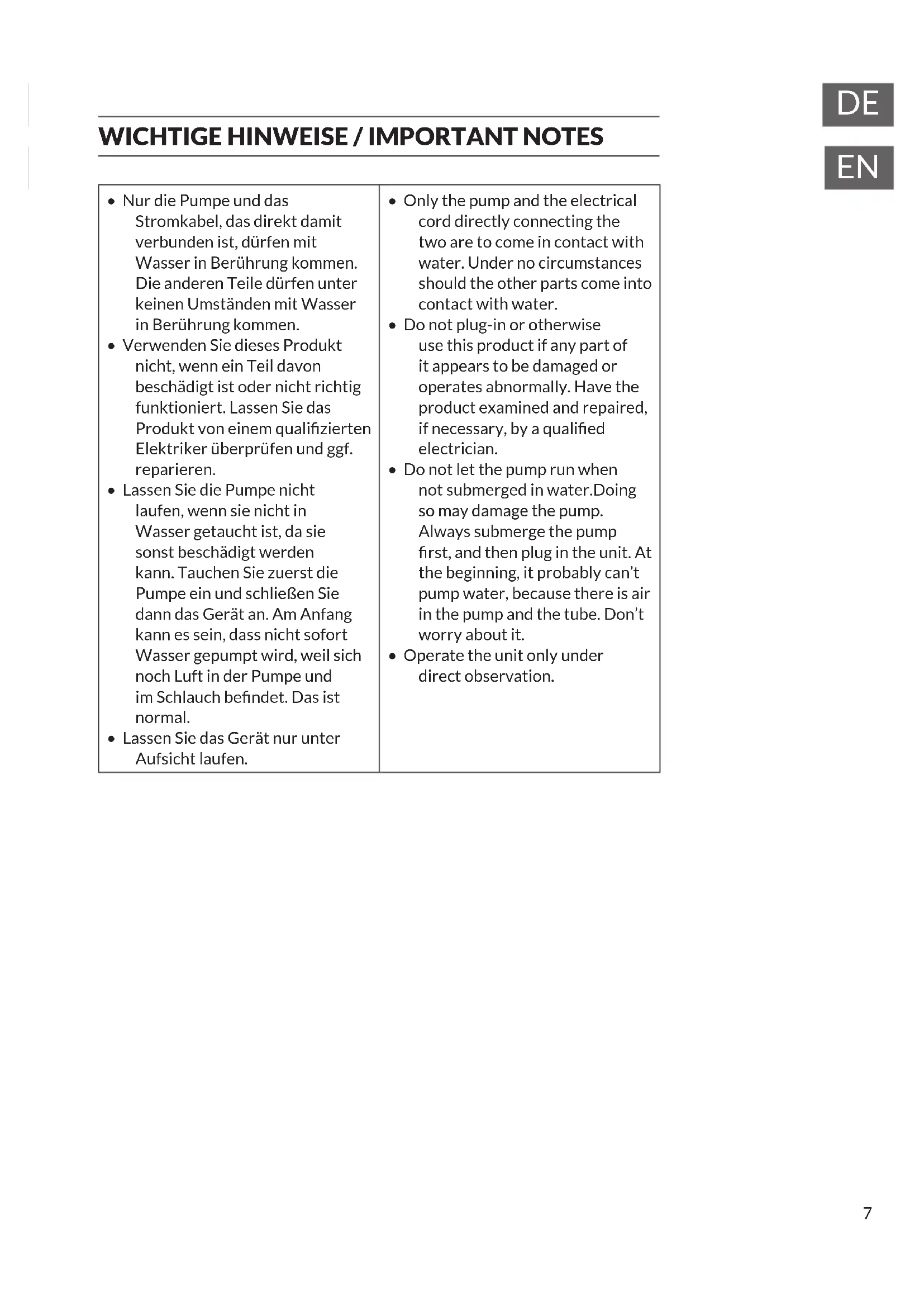 - Nur die Pumpe und das Stromkabel, das direkt damit verbunden ist, dürfen mit Wasser in Berührung kommen. Die anderen Teile dürfen unter keinen Umständen mit Wasser in Berührung kommen.
