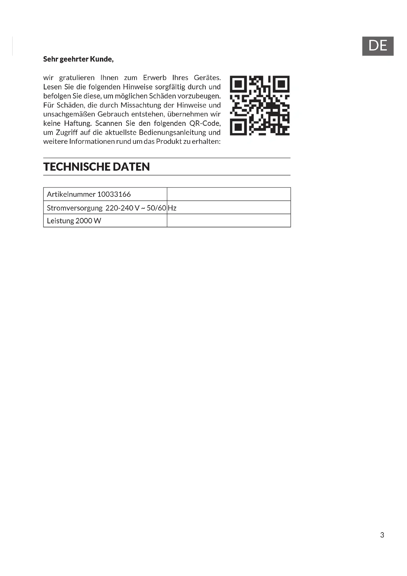 Sehr geehrter Kunde, wir gratulieren Ihnen zum Erwerb Ihres Gerätes. Lesen Sie die folgenden Hinweise sorgfältig durch und befolgen Sie diese, um möglichen Schäden vorzubeugen. Für Schäden, die durch Missachtung der Hinweise und unsachgemäßen Gebrauch entstehen, übernehmen wir keine Haftung. Scannen Sie den folgenden QR-Code, um Zugriff auf die aktuellste Bedienungsanleitung und weitere Informationen rund um das Produkt zu erhalten: TECHNISCHE DATEN Artikelnummer 10033166 Stromversorgung 220-240 V ~ 50/60 Hz Leistung 2000 W4