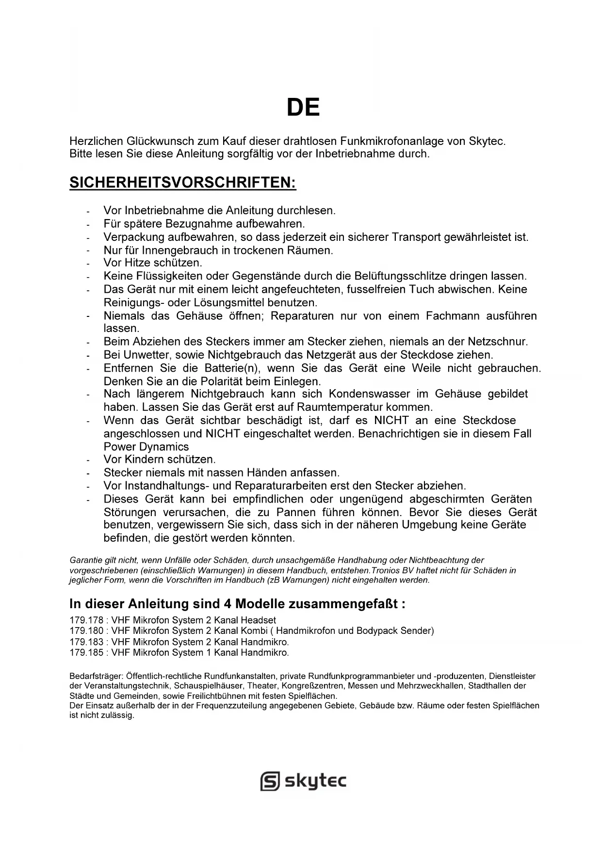 Dieses Gerät kann bei empfindlichen oder ungenügend abgeschirmten Geräten Störungen verursachen, die zu Pannen führen können. Bevor Sie dieses Gerät benutzen, vergewissern Sie sich, dass sich in der näheren Umgebung keine Geräte befinden, die gestört werden könnten. Garantie gilt nicht, wenn Unfälle oder Schäden, durch unsachgemäße Handhabung oder Nichtbeachtung der vorgeschriebenen (einschließlich Warnungen) in diesem Handbuch, entstehen.Tronios BV haftet nicht für Schäden in jeglicher Form, wenn die Vorschriften im Handbuch (zB Warnungen) nicht eingehalten werden. In dieser Anleitung sind 4 Modelle zusammengefaßt :