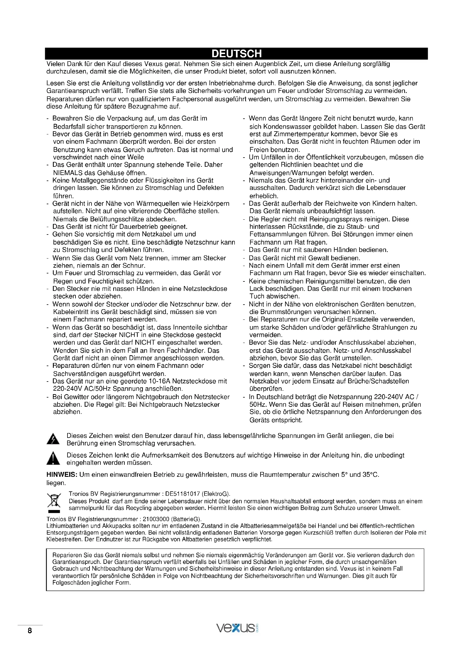 Deze toets heeft twee functies: - Kortstondig indrukken, om het volgende bestand te selecteren. - Lang indrukken, om versneld vooruit te zoeken.8 DEUTSCH Vielen Dank für den Kauf dieses Vexus gerat. Nehmen Sie sich einen Augenblick Zeit, um diese Anleitung sorgfältig durchzulesen, damit sie die Möglichkeiten, die unser Produkt bietet, sofort voll ausnutzen können. Lesen Sie erst die Anleitung vollständig vor der ersten Inbetriebnahme durch. Befolgen Sie die Anweisung, da sonst jeglicher Garantieanspruch verfällt. Treffen Sie stets alle Sicherheits-vorkehrungen um Feuer und/oder Stromschlag zu vermeiden. Reparaturen dürfen nur von qualifiziertem Fachpersonal ausgeführt werden, um Stromschlag zu vermeiden. Bewahren Sie diese Anleitung für spätere Bezugnahme auf. - Bewahren Sie die Verpackung auf, um das Gerät im Bedarfsfall sicher transportieren zu können. - Bevor das Gerät in Betrieb genommen wird, muss es erst von einem Fachmann überprüft werden. Bei der ersten Benutzung kann etwas Geruch auftreten. Das ist normal und verschwindet nach einer Weile - Das Gerät enthält unter Spannung stehende Teile. Daher NIEMALS das Gehäuse öffnen. - Keine Metallgegenstände oder Flüssigkeiten ins Gerät dringen lassen. Sie können zu Stromschlag und Defekten führen. - Gerät nicht in der Nähe von Wärmequellen wie Heizkörpern aufstellen. Nicht auf eine vibrierende Oberfläche stellen. Niemals die Belüftungsschlitze abdecken. - Das Gerät ist nicht für Dauerbetrieb geeignet. - Gehen Sie vorsichtig mit dem Netzkabel um und beschädigen Sie es nicht. Eine beschädigte Netzschnur kann zu Stromschlag und Defekten führen. - Wenn Sie das Gerät vom Netz trennen, immer am Stecker ziehen, niemals an der Schnur. - Um Feuer und Stromschlag zu vermeiden, das Gerät vor Regen und Feuchtigkeit schützen. - Den Stecker nie mit nassen Händen in eine Netzsteckdose stecken oder abziehen. - Wenn sowohl der Stecker und/oder die Netzschnur bzw. der Kabeleintritt ins Gerät beschädigt sind, müssen sie von einem Fachmann repariert werden. - Wenn das Gerät so beschädigt ist, dass Innenteile sichtbar sind, darf der Stecker NICHT in eine Steckdose gesteckt werden und das Gerät darf NICHT eingeschaltet werden. Wenden Sie sich in dem Fall an Ihren Fachhändler. Das Gerät darf nicht an einen Dimmer angeschlossen werden. - Reparaturen dürfen nur von einem Fachmann oder Sachverständigen ausgeführt werden. - Das Gerät nur an eine geerdete 10-16A Netzsteckdose mit 220-240V AC/50Hz Spannung anschließen. - Bei Gewitter oder längerem Nichtgebrauch den Netzstecker abziehen. Die Regel gilt: Bei Nichtgebrauch Netzstecker abziehen. - Wenn das Gerät längere Zeit nicht benutzt wurde, kann sich Kondenswasser gebildet haben. Lassen Sie das Gerät erst auf Zimmertemperatur kommen, bevor Sie es einschalten. Das Gerät nicht in feuchten Räumen oder im Freien benutzen. - Um Unfällen in der Öffentlichkeit vorzubeugen, müssen die geltenden Richtlinien beachtet und die Anweisungen/Warnungen befolgt werden. - Niemals das Gerät kurz hintereinander ein- und ausschalten. Dadurch verkürzt sich die Lebensdauer erheblich. - Das Gerät außerhalb der Reichweite von Kindern halten. Das Gerät niemals unbeaufsichtigt lassen. - Die Regler nicht mit Reinigungssprays reinigen. Diese hinterlassen Rückstände, die zu Staub- und Fettansammlungen führen. Bei Störungen immer einen Fachmann um Rat fragen. - Das Gerät nur mit sauberen Händen bedienen. - Das Gerät nicht mit Gewalt bedienen. - Nach einem Unfall mit dem Gerät immer erst einen Fachmann um Rat fragen, bevor Sie es wieder einschalten. - Keine chemischen Reinigungsmittel benutzen, die den Lack beschädigen. Das Gerät nur mit einem trockenen Tuch abwischen. - Nicht in der Nähe von elektronischen Geräten benutzen, die Brummstörungen verursachen können. - Bei Reparaturen nur die Original-Ersatzteile verwenden, um starke Schäden und/oder gefährliche Strahlungen zu vermeiden. - Bevor Sie das Netz- und/oder Anschlusskabel abziehen, erst das Gerät ausschalten. Netz- und Anschlusskabel abziehen, bevor Sie das Gerät umstellen. - Sorgen Sie dafür, dass das Netzkabel nicht beschädigt werden kann, wenn Menschen darüber laufen. Das Netzkabel vor jedem Einsatz auf Brüche/Schadstellen überprüfen. - In Deutschland beträgt die Netzspannung 220-240V AC / 50Hz. Wenn Sie das Gerät auf Reisen mitnehmen, prüfen Sie, ob die örtliche Netzspannung den Anforderungen des Geräts entspricht. Dieses Zeichen weist den Benutzer darauf hin, dass lebensgefährliche Spannungen im Gerät anliegen, die bei Berührung einen Stromschlag verursachen. Dieses Zeichen lenkt die Aufmerksamkeit des Benutzers auf wichtige Hinweise in der Anleitung hin, die unbedingt eingehalten werden müssen. HINWEIS: Um einen einwandfreien Betrieb zu gewährleisten, muss die Raumtemperatur zwischen 5° und 35°C. liegen. Tronios BV Registrierungsnummer : DE51181017 (ElektroG). Dieses Produkt darf am Ende seiner Lebensdauer nicht über den normalen Haushaltsabfall entsorgt werden, sondern muss an einem sammelpunkt für das Recycling abgegeben werden. Hiermit leisten Sie einen wichtigen Beitrag zum Schutze unserer Umwelt. Tronios BV Registrierungsnummer : 21003000 (BatterieG). Lithiumbatterien und Akkupacks sollten nur im entladenen Zustand in die Altbatteriesammelgefäße bei Handel und bei öffentlich-rechtlichen Entsorgungsträgern gegeben werden. Bei nicht vollständig entladenen Batterien Vorsorge gegen Kurzschlüß treffen durch Isolieren der Pole mit Klebestreifen. Der Endnutzer ist zur Rückgabe von Altbatterien gesetzlich verpflichtet.