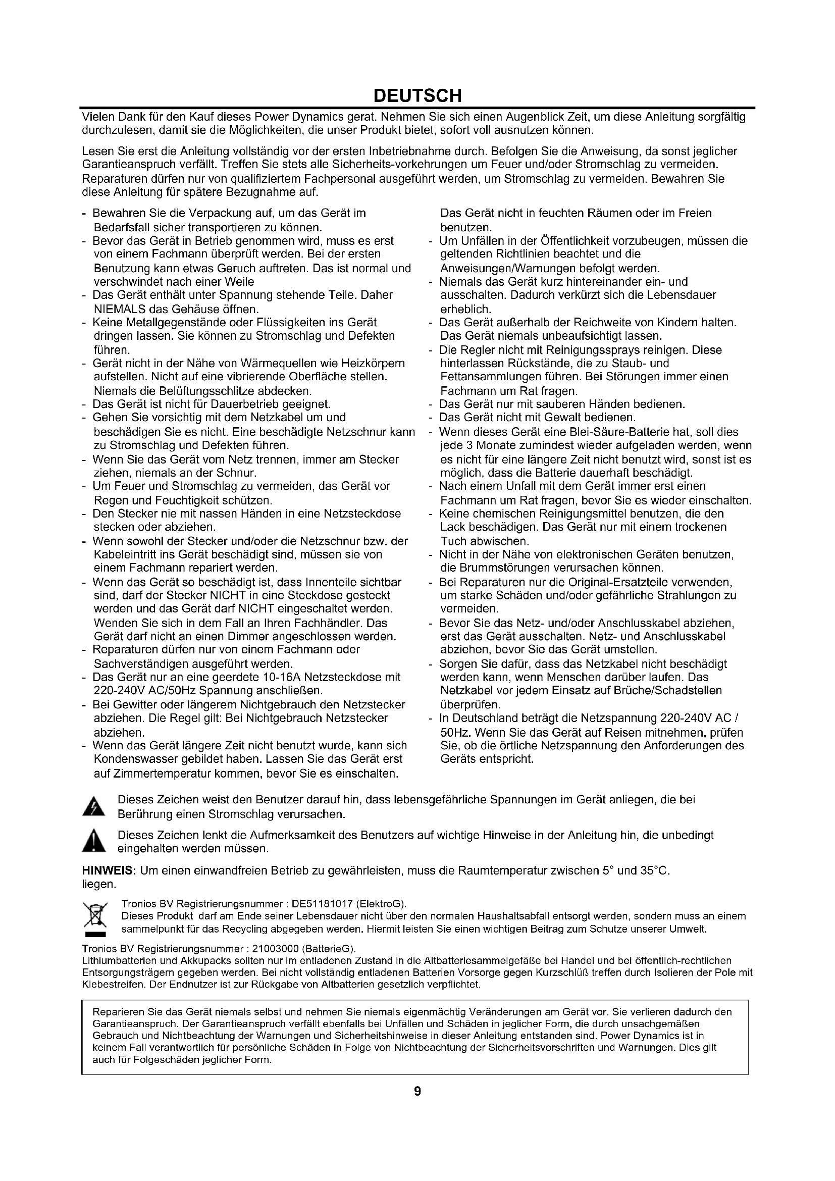 BEDIENING Schakel de ontvanger in met de aan / uit-schakelaar. Schroef of open het batterijkvak van de microfoon en plaats nieuwe of volledig opgeladen batterijen. Druk gedurende 2 seconden op de aan / uit-schakelaar van de microfoon om in te schakelen. Selecteer automatisch (auto search) of handmatig (IR) zoeken functie. Automatisch Voer de automatische kanaalscan uit op elke ontvangersectie om een storingsvrije transmissiekanaal te selecteren. Druk op de ▲ of ▼ toetsen om Auto Seach te selecteren en bevestig met de knop SET. Selecteer YES en bevestig opnieuw met SET toets, het automatisch zoeken begint, wanneer de scan is voltooid, toont het display het nummer van het gevonden kanaal. Handmatig Druk op de knop ▲ of ▼ toetsen om IR te selecteren en bevestig met de SET toets. Selecteer YES en bevestig opnieuw met SET. Selecteer een transmissiekanaal, met de ▲ en ▼ toetsen op de ontvanger. Houd de IR-sensor van de microfoon dicht bij de IR-sensor van de ontvanger. Druk op de SET-toets van het betreffende kanaal om de microfoon te synchroniseren. Attentie: hoe meer segmenten worden weergegeven, hoe beter is de ontvangst. Schroef of sluit het batterijvak van de microfoon. Opmerking: druk twee keer kort op de AAN / UIT-knop op de ontvanger om het menu te verlaten. Voor optimale ontvangst: Plaats de ontvanger zodanig dat er niets de zichtbaarheid van de microfoons (inclusief het publiek) belemmert. Plaats geen microfoons en ontvangers waar zich metalen of andere dichte materialen kunnen bevinden. Plaats de ontvanger boven op het apparatuurrek. Verwijder nabijgelegen bronnen van draadloze interferentie, zoals mobiele telefoons, tweerichtingsradio's, computers, mediaspelers, Wi-Fi-apparaten en digitale signaalprocessors. Laad of vervang de batterij van de microfoon. Houd de microfoons meer dan twee meter uit elkaar. Houd de microfoons en ontvanger op meer dan 5 meter afstand van elkaar. Markeer tijdens de soundcheck storingsgebieden en vraag de presentatoren of artiest om die gebieden te vermijden. HEADSET MICROFOON Verbind de connector van de meegeleverde headsetmicrofoon met de aansluit connector van de zender. Plaats de microfoon van de headset ongeveer 15mm van de opening van uw mond.9 DEUTSCH Vielen Dank für den Kauf dieses Power Dynamics gerat. Nehmen Sie sich einen Augenblick Zeit, um diese Anleitung sorgfältig durchzulesen, damit sie die Möglichkeiten, die unser Produkt bietet, sofort voll ausnutzen können. Lesen Sie erst die Anleitung vollständig vor der ersten Inbetriebnahme durch. Befolgen Sie die Anweisung, da sonst jeglicher Garantieanspruch verfällt. Treffen Sie stets alle Sicherheits-vorkehrungen um Feuer und/oder Stromschlag zu vermeiden. Reparaturen dürfen nur von qualifiziertem Fachpersonal ausgeführt werden, um Stromschlag zu vermeiden. Bewahren Sie diese Anleitung für spätere Bezugnahme auf. - Bewahren Sie die Verpackung auf, um das Gerät im Bedarfsfall sicher transportieren zu können. - Bevor das Gerät in Betrieb genommen wird, muss es erst von einem Fachmann überprüft werden. Bei der ersten Benutzung kann etwas Geruch auftreten. Das ist normal und verschwindet nach einer Weile - Das Gerät enthält unter Spannung stehende Teile. Daher NIEMALS das Gehäuse öffnen. - Keine Metallgegenstände oder Flüssigkeiten ins Gerät dringen lassen. Sie können zu Stromschlag und Defekten führen. - Gerät nicht in der Nähe von Wärmequellen wie Heizkörpern aufstellen. Nicht auf eine vibrierende Oberfläche stellen. Niemals die Belüftungsschlitze abdecken. - Das Gerät ist nicht für Dauerbetrieb geeignet. - Gehen Sie vorsichtig mit dem Netzkabel um und beschädigen Sie es nicht. Eine beschädigte Netzschnur kann zu Stromschlag und Defekten führen. - Wenn Sie das Gerät vom Netz trennen, immer am Stecker ziehen, niemals an der Schnur. - Um Feuer und Stromschlag zu vermeiden, das Gerät vor Regen und Feuchtigkeit schützen. - Den Stecker nie mit nassen Händen in eine Netzsteckdose stecken oder abziehen. - Wenn sowohl der Stecker und/oder die Netzschnur bzw. der Kabeleintritt ins Gerät beschädigt sind, müssen sie von einem Fachmann repariert werden. - Wenn das Gerät so beschädigt ist, dass Innenteile sichtbar sind, darf der Stecker NICHT in eine Steckdose gesteckt werden und das Gerät darf NICHT eingeschaltet werden. Wenden Sie sich in dem Fall an Ihren Fachhändler. Das Gerät darf nicht an einen Dimmer angeschlossen werden. - Reparaturen dürfen nur von einem Fachmann oder Sachverständigen ausgeführt werden. - Das Gerät nur an eine geerdete 10-16A Netzsteckdose mit 220-240V AC/50Hz Spannung anschließen. - Bei Gewitter oder längerem Nichtgebrauch den Netzstecker abziehen. Die Regel gilt: Bei Nichtgebrauch Netzstecker abziehen. - Wenn das Gerät längere Zeit nicht benutzt wurde, kann sich Kondenswasser gebildet haben. Lassen Sie das Gerät erst auf Zimmertemperatur kommen, bevor Sie es einschalten. Das Gerät nicht in feuchten Räumen oder im Freien benutzen. - Um Unfällen in der Öffentlichkeit vorzubeugen, müssen die geltenden Richtlinien beachtet und die Anweisungen/Warnungen befolgt werden. - Niemals das Gerät kurz hintereinander ein- und ausschalten. Dadurch verkürzt sich die Lebensdauer erheblich. - Das Gerät außerhalb der Reichweite von Kindern halten. Das Gerät niemals unbeaufsichtigt lassen. - Die Regler nicht mit Reinigungssprays reinigen. Diese hinterlassen Rückstände, die zu Staub- und Fettansammlungen führen. Bei Störungen immer einen Fachmann um Rat fragen. - Das Gerät nur mit sauberen Händen bedienen. - Das Gerät nicht mit Gewalt bedienen. - Wenn dieses Gerät eine Blei-Säure-Batterie hat, soll dies jede 3 Monate zumindest wieder aufgeladen werden, wenn es nicht für eine längere Zeit nicht benutzt wird, sonst ist es möglich, dass die Batterie dauerhaft beschädigt. - Nach einem Unfall mit dem Gerät immer erst einen Fachmann um Rat fragen, bevor Sie es wieder einschalten. - Keine chemischen Reinigungsmittel benu