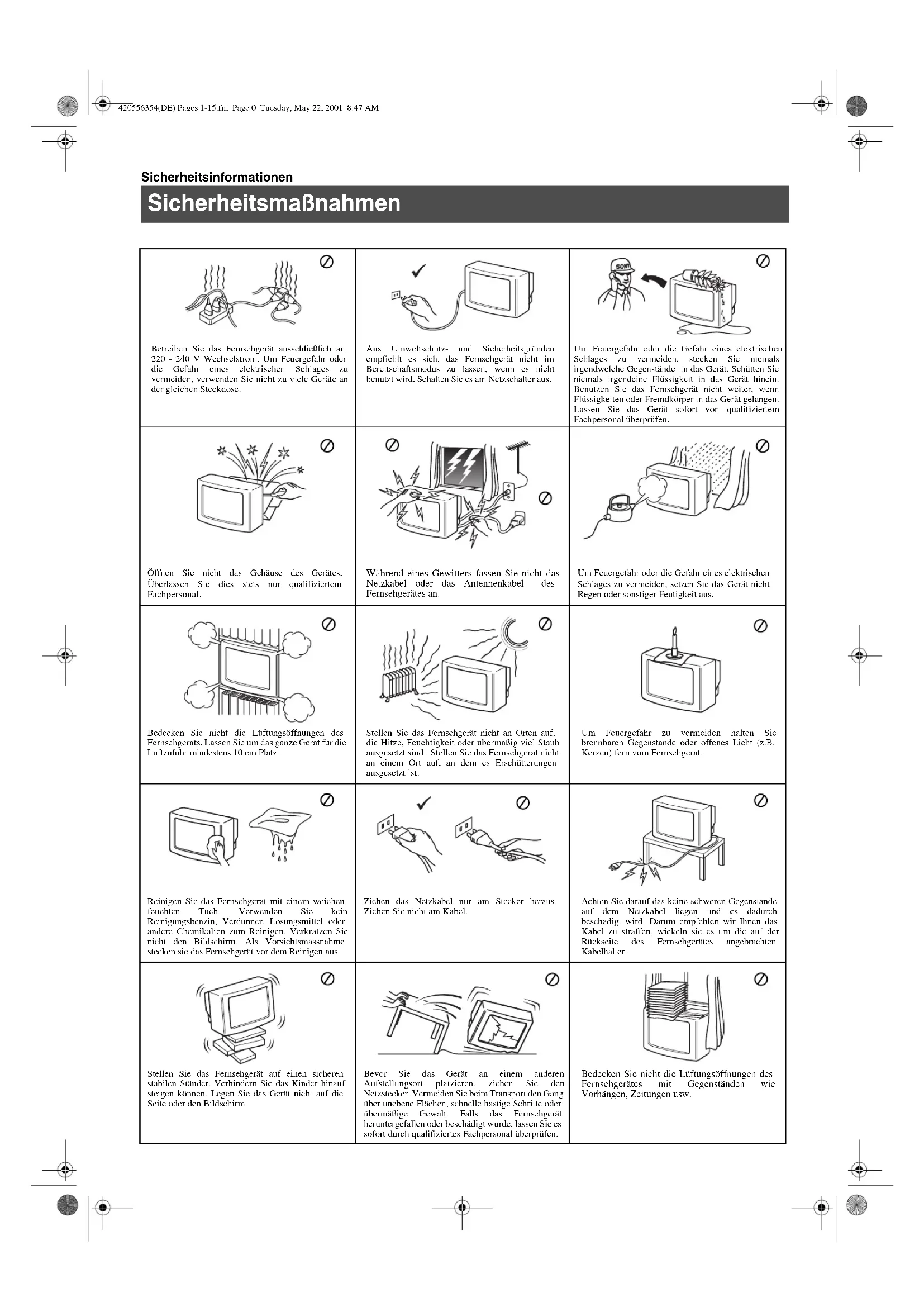 die Gefahr eines elektrischen Schlages zu vermeiden, verwenden Sie nicht zu viele Geräte an der gleichen Steckdose. Aus Umweltschutz- und Sicherheitsgründen empfiehlt es sich, das Fernsehgerät nicht im Bereitschaftsmodus zu lassen, wenn es nicht benutzt wird. Schalten Sie es am Netzschalter aus. Öffnen Sie nicht das Gehäuse des Gerätes. Überlassen Sie dies stets nur qualifiziertem Fachpersonal. Um Feuergefahr oder die Gefahr eines elektrischen Schlages zu vermeiden, setzen Sie das Gerät nicht Regen oder sonstiger Feutigkeit aus. Während eines Gewitters fassen Sie nicht das Netzkabel oder das Antennenkabel des Fernsehgerätes an. Stellen Sie das Fernsehgerät nicht an Orten auf, die Hitze, Feuchtigkeit oder übermäßig viel Staub ausgesetzt sind. Stellen Sie das Fernsehgerät nicht an einem Ort auf, an dem es Erschütterungen ausgesetzt ist. Um Feuergefahr zu vermeiden halten Sie brennbaren Gegenstände oder offenes Licht (z.B. Kerzen) fern vom Fernsehgerät. Reinigen Sie das Fernsehgerät mit einem weichen, feuchten Tuch. Verwenden Sie kein Reinigungsbenzin, Verdünner, Lösungsmittel oder andere Chemikalien zum Reinigen. Verkratzen Sie nicht den Bildschirm. Als Vorsichtsmassnahme stecken sie das Fernsehgerät vor dem Reinigen aus. Ziehen das Netzkabel nur am Stecker heraus. Ziehen Sie nicht am Kabel. Achten Sie darauf das keine schweren Gegenstände auf dem Netzkabel liegen und es dadurch beschädigt wird. Darum empfehlen wir Ihnen das Kabel zu straffen, wickeln sie es um die auf der Rückseite des Fernsehgerätes angebrachten Kabelhalter. Stellen Sie das Fernsehgerät auf einen sicheren stabilen Ständer. Verhindern Sie das Kinder hinauf steigen können. Legen Sie das Gerät nicht auf die Seite oder den Bildschirm. Bevor Sie das Gerät an einem anderen Aufstellungsort platzieren, ziehen Sie den Netzstecker. Vermeiden Sie beim Transport den Gang über unebene Flächen, schnelle hastige Schritte oder übermäßige Gewalt. Falls das Fernsehgerät heruntergefallen oder beschädigt wurde, lassen Sie es sofort durch qualifiziertes Fachpersonal überprüfen. Bedecken Sie nicht die Lüftungsöffnungen des Fernsehgerätes mit Gegenständen wie Vorhängen, Zeitungen usw. Um Feuergefahr oder die Gefahr eines elektrischen Schlages zu vermeiden, stecken Sie niemals irgendwelche Gegenstände in das Gerät. Schütten Sie niemals irgendeine Flüssigkeit in das Gerät hinein. Benutzen Sie das Fernsehgerät nicht weiter, wenn Flüssigkeiten oder Fremdkörper in das Gerät gelangen. Lassen Sie das Gerät sofort von qualifiziertem Fachpersonal überprüfen. Bedecken Sie nicht die Lüftungsöffnungen des Fernsehgeräts. Lassen Sie um das ganze Gerät für die Luftzufuhr mindestens 10 cm Platz. 420556354(DE) Pages 1-15.fm Page 0 Tuesday, May 22, 2001 8:47 AM1 Sicherheitshinweis Verwenden Sie immer Fernsehstandfüsse, die kräftig und stabil genug sind, um das Gewicht und die Größe des Fernsehers aufzunehmen. Durch das einzigartige geschwungene Design dieses Fernsehers empfiehlt Sony ihnen die nachfolgend genannten Standfüße. Für das Modell KV-28FQ75 den Standfuß SU-28FQ1 und für das Modell KV-32FQ75 den SU-32FQ1. Falls Sie diese Empfehlung nicht nutzen wollen, sollten Sie unbedingt sicherstellen, dass die Oberfläche des Tisches oder Vitrine so groß ist, dass die drei Füße des Fernsehers nicht darüber hinausragen. Blockieren Sie die Lüftungsöffnungen nicht, und decken Sie sie nicht ab. Lassen Sie um das ganze Fernsehgerät für die Luftzufuhr mindestens 10 cm Platz. Sicherheitsinformationen Inhalt Inhalt Installation