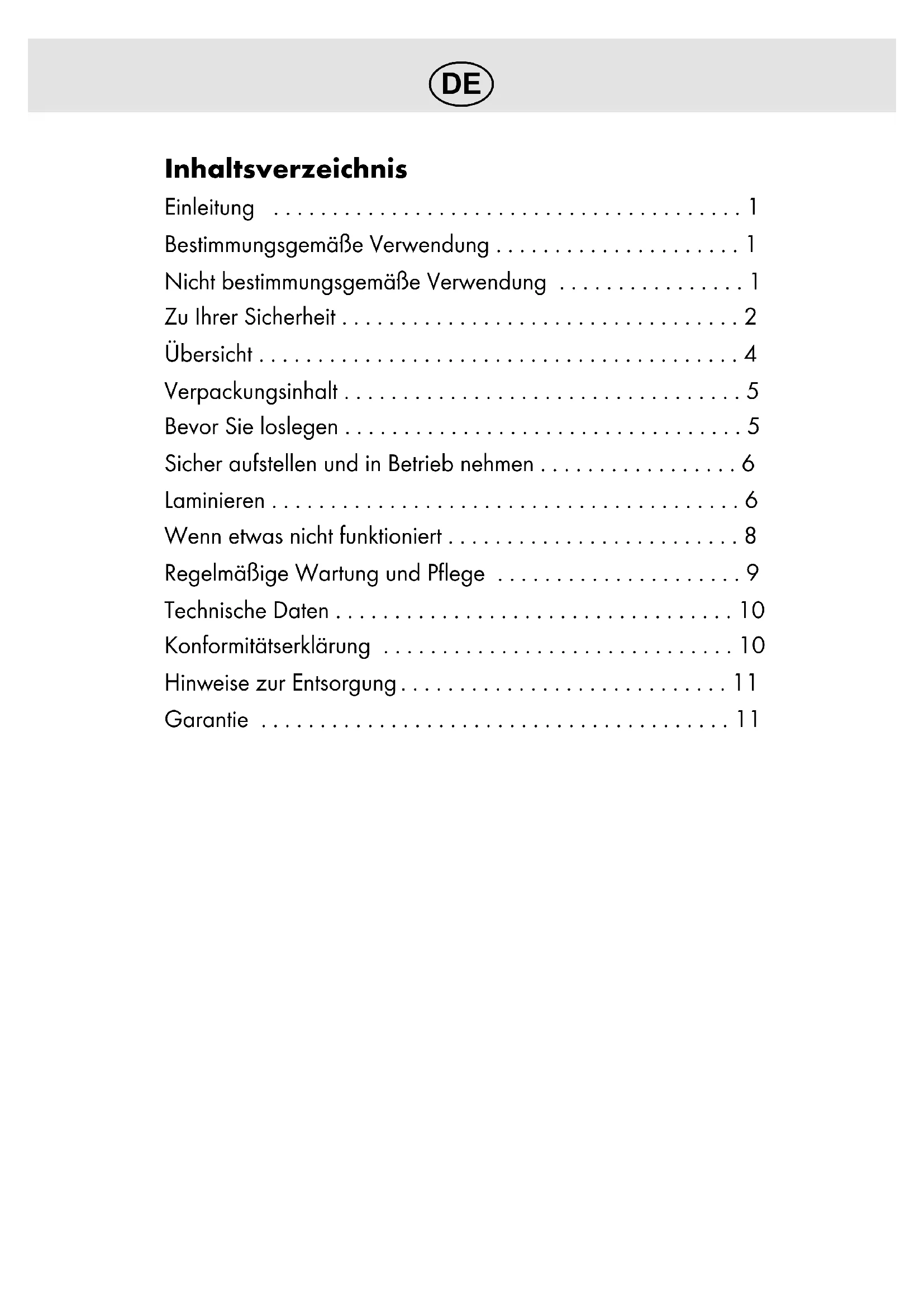 Einleitung Einleitung Wir beglückwünschen Sie zum Kauf Ihres neuen Laminiergeräts A 6040 - im Folgenden: Laminiergerät. Sie haben sich damit für ein hochwertiges Laminiergerät entschie- den. Die Bedienungsanleitung ist Teil dieses Laminiergeräts. Sie enthält wichtige Hinweise für Sicherheit, Gebrauch und Entsorgung. Lesen Sie die Bedienungsanleitung aufmerksam durch und beachten Sie die Warnhinweise und Informationen bei der Handhabung Ihres Laminierge- räts. Benutzen Sie das Laminiergerät nur wie beschrieben und für die angegebenen Einsatzbereiche. Bewahren Sie die Bedienungsanleitung für eine spätere Verwendung auf und händigen Sie alle Unterlagen bei Weitergabe des Laminiergeräts an Dritte mit aus. Bestimmungsgemäße Verwendung Das Laminiergerät ist geeignet für das Laminieren mit Heißlaminierfolien (bis zu einer maximalen Größe von DIN A2) mit einer Laminierfolienstär- ke von 80 - 250 micron, wobei die Gesamtdicke der zu laminierenden Dokumente (Fotos, Bilder, Karten, Papier usw.) bei maximal 0,8 mm lie- gen darf. Das Laminiergerät ist nur für den privaten Gebrauch und nicht für den gewerblichen Gebrauch geeignet. Nicht bestimmungsgemäße Verwendung Das Laminiergerät ist nicht geeignet für das Laminieren ungeeigneter Materialien oder zum Verwenden außerhalb der in den Technischen Daten beschriebenen zulässigen Umgebungsbedingungen. Jede andere Verwendung als die in der bestimmungsgemäßen Verwendung be schriebenen Verwendung ist nicht bestimmungsgemäß. Eigenmächti- ge Ver änderungen oder Umbauten sind nicht zulässig. Önen Sie das Laminiergerät in keinem Fall selbst und führen Sie keine eigenen Repara- turversuche durch.