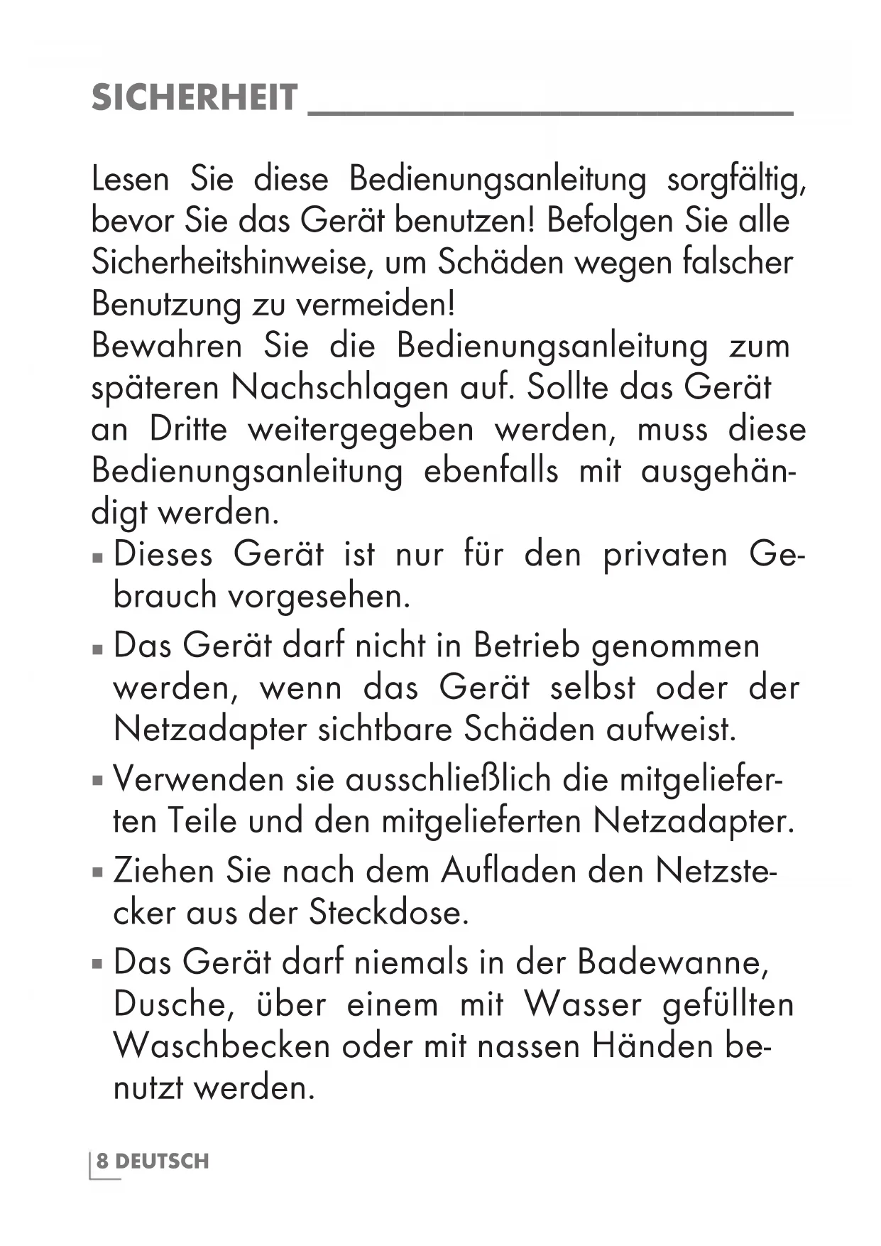 SICHERHEIT _________________________ Lesen Sie diese Bedienungsanleitung sorgfältig, bevor Sie das Gerät benutzen! Befolgen Sie alle Sicherheitshinweise, um Schäden wegen falscher Benutzung zu vermeiden! Bewahren Sie die Bedienungsanleitung zum späteren Nachschlagen auf. Sollte das Gerät an Dritte weitergegeben werden, muss diese Bedienungsanleitung ebenfalls mit ausgehän- digt werden.