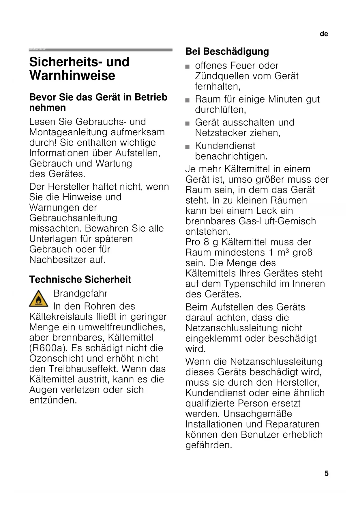 deInhaltsverzeichnis deGebrauchsanleitung Sicherheits- und Warnhinweise Bevor Sie das Gerät in Betrieb nehmen Lesen Sie Gebrauchs- und Montageanleitung aufmerksam durch! Sie enthalten wichtige Informationen über Aufstellen, Gebrauch und Wartung des Gerätes. Der Hersteller haftet nicht, wenn Sie die Hinweise und Warnungen der Gebrauchsanleitung missachten. Bewahren Sie alle Unterlagen für späteren Gebrauch oder für Nachbesitzer auf. Technische Sicherheit Brandgefahr In den Rohren des Kältekreislaufs fließt in geringer Menge ein umweltfreundliches, aber brennbares, Kältemittel (R600a). Es schädigt nicht die Ozonschicht und erhöht nicht den Treibhauseffekt. Wenn das Kältemittel austritt, kann es die Augen verletzen oder sich entzünden. Bei Beschädigung ■ offenes Feuer oder Zündquellen vom Gerät fernhalten, ■ Raum für einige Minuten gut durchlüften, ■ Gerät ausschalten und Netzstecker ziehen, ■ Kundendienst benachrichtigen. Je mehr Kältemittel in einem Gerät ist, umso größer muss der Raum sein, in dem das Gerät steht. In zu kleinen Räumen kann bei einem Leck ein brennbares Gas-Luft-Gemisch entstehen. Pro 8 g Kältemittel muss der Raum mindestens 1 m³ groß sein. Die Menge des Kältemittels Ihres Gerätes steht auf dem Typenschild im Inneren des Gerätes. Beim Aufstellen des Geräts darauf achten, dass die Netzanschlussleitung nicht eingeklemmt oder beschädigt wird. Wenn die Netzanschlussleitung dieses Geräts beschädigt wird, muss sie durch den Hersteller, Kundendienst oder eine ähnlich qualifizierte Person ersetzt werden. Unsachgemäße Installationen und Reparaturen können den Benutzer erheblich gefährden.de