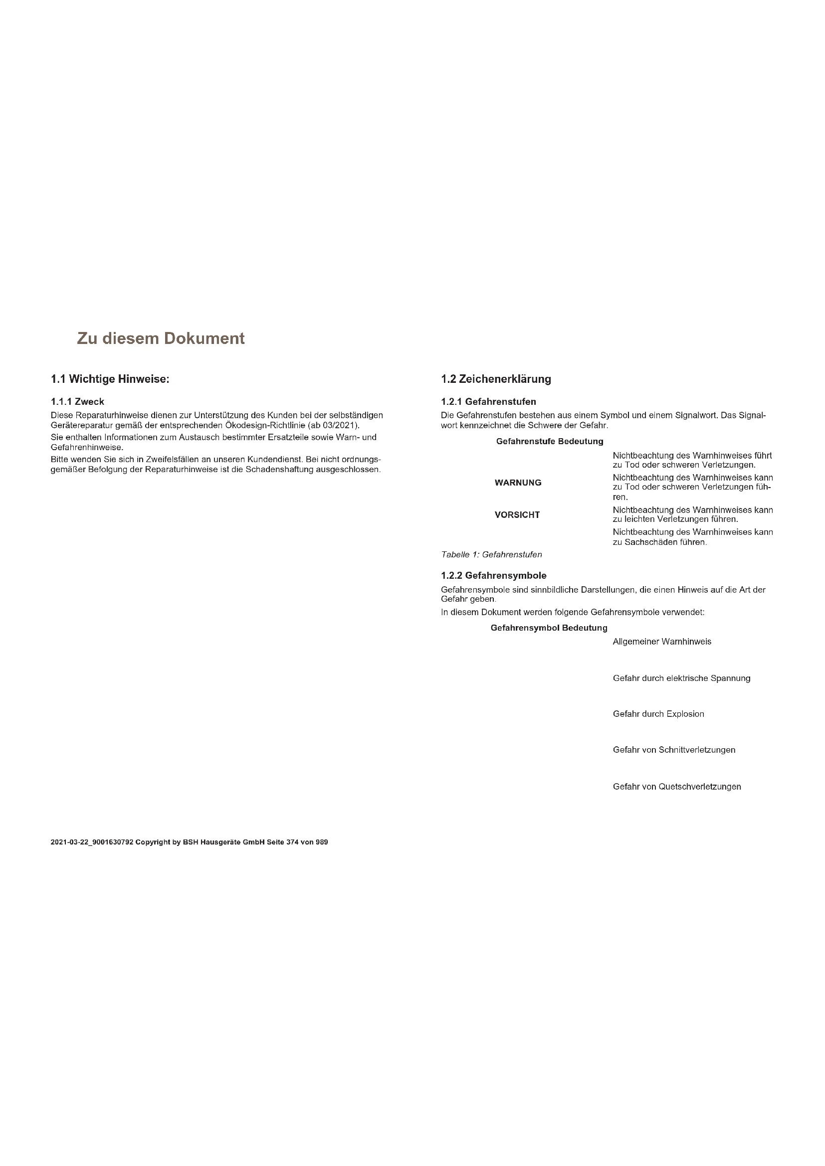 Diese Reparaturhinweise dienen zur Unterstützung des Kunden bei der selbständigen Gerätereparatur gemäß der entsprechenden Ökodesign-Richtlinie (ab 03/2021). Sie enthalten Informationen zum Austausch bestimmter Ersatzteile sowie Warn- und Gefahrenhinweise. Bitte wenden Sie sich in Zweifelsfällen an unseren Kundendienst. Bei nicht ordnungs- gemäßer Befolgung der Reparaturhinweise ist die Schadenshaftung ausgeschlossen.