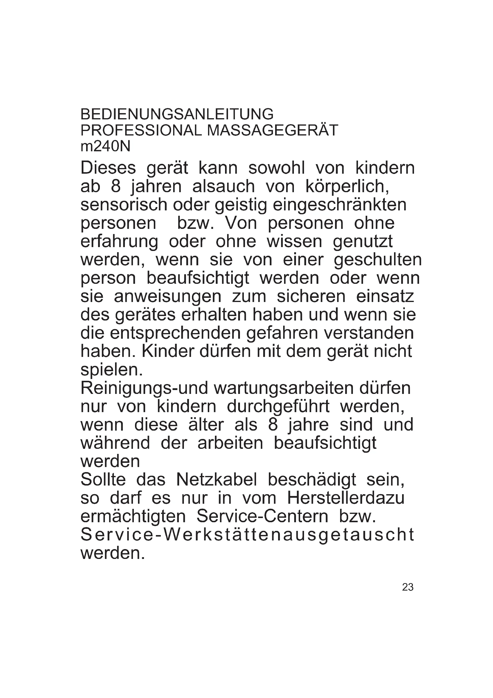 C23 Dieses gerät kann sowohl von kindern ab 8 jahren alsauch von körperlich, sensorisch oder geistig eingeschränkten personen bzw. Von personen ohne erfahrung oder ohne wissen genutzt werden, wenn sie von einer geschulten person beaufsichtigt werden oder wenn sie anweisungen zum sicheren einsatz des gerätes erhalten haben und wenn sie die entsprechenden gefahren verstanden haben. Kinder dürfen mit dem gerät nicht spielen. Reinigungs-und wartungsarbeiten dürfen nur von kindern durchgeführt werden, wenn diese älter als 8 jahre sind und während der arbeiten beaufsichtigt werden Sollte das Netzkabel beschädigt sein, so darf es nur in vom Herstellerdazu ermächtigten Service-Centern bzw. Service-Werkstättenausgetauscht werden. BEDIENUNGSANLEITUNG