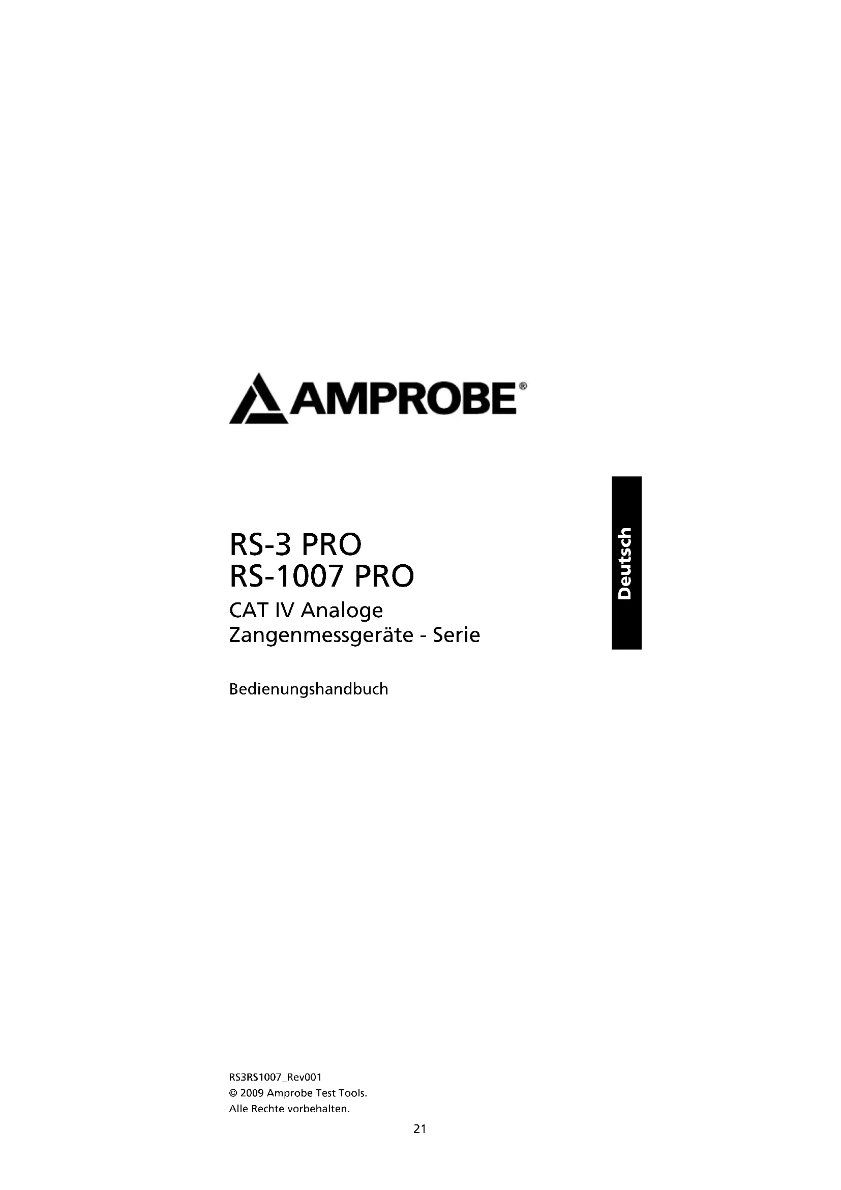 MAX 600V B Analog Clamp Meter F 0.5A 1000V + 1.5 V AAA Fig 3. Ohms Fig 4. Fusible et pile21 Deutsch RS-3 PRO RS-1007 PRO CAT IV Analoge Zangenmessgeräte - Serie Bedienungshandbuch RS3RS1007_Rev001© 2009 Amprobe Test Tools.Alle Rechte vorbehalten.22 Beschränkte Gewährleistung und Haftungsbeschränkung Es wird gewährleistet, dass dieses Amprobe-Produkt für die Dauer von einem Jahr ab dem Kaufdatum frei von Material- und Fertigungsdefekten ist. Diese Gewährleistung erstreckt sich nicht auf Sicherungen, Einwegbatterien oder Schäden durch Unfälle, Nachlässigkeit, Missbrauch, Änderungen oder abnormale Betriebsbedingungen bzw. unsachgemäße Handhabung. Die Garantieverpflichtung von Amprobe beschränkt sich darauf, dass Amprobe nach eigenem Ermessen den Kaufpreis ersetzt oder aber das defekte Produkt unentgeltlich repariert oder austauscht. Die Verkaufsstellen sind nicht dazu berechtigt, diese Gewährleistung im Namen von Amprobe zu erweitern. Um während der Gewährleistungsperiode Serviceleistungen in Anspruch zu nehmen, das Produkt mit Kaufnachweis an ein autorisiertes Amprobe Test Tools Service-Center oder an einen Amprobe-Fachhändler/- Distributor einsenden. Nähere Einzelheiten siehe Abschnitt „Reparatur“. Diese Gewährleistung stellt den einzigen und alleinigen Rechtsanspruch auf Schadenersatz dar. Alle anderen Gewährleistungen, vertraglich geregelte oder gesetzlich vorgeschriebene, einschließlich der gesetzlichen Gewährleistung der Marktfähigkeit und der Eignung für einen bestimmten Zweck, werden hiermit ausgeschlossen. Weder Amprobe noch dessen Muttergesellschaft oder Tochtergesellschaften übernehmen Haftung für spezielle, indirekte, Neben- oder Folgeschäden oder für Verluste, die auf beliebiger Ursache oder Rechtstheorie beruhen. Weil einige Staaten oder Länder den Ausschluss oder die Einschränkung einer implizierten Gewährleistung sowie den Ausschluss von Begleit- oder Folgeschäden nicht zulassen, ist diese Gewährleistungsbeschränkung möglicherweise für Sie nicht gültig. Reparatur Alle Geräten, die innerhalb oder außerhalb des Garantiezeitraums zur Reparatur oder Kalibrierung eingesendet werden, müssen mit folgenden Informationen und Dokumenten versehen werden: Name des Kunden, Firmenname, Adresse, Telefonnummer und Kaufbeleg. Zusätzlich bitte dem Messgerät eine kurze Beschreibung des Problems oder der gewünschten Wartung sowie die Messleitungen beilegen. Die Gebühren für Reparaturen außerhalb der Garantie oder für den Ersatz von Instrumenten müssen per Scheck, Geldanweisung oder Kreditkarte (Kreditkartennummer mit Ablaufdatum) beglichen werden oder es muss ein Auftrag an Amprobe