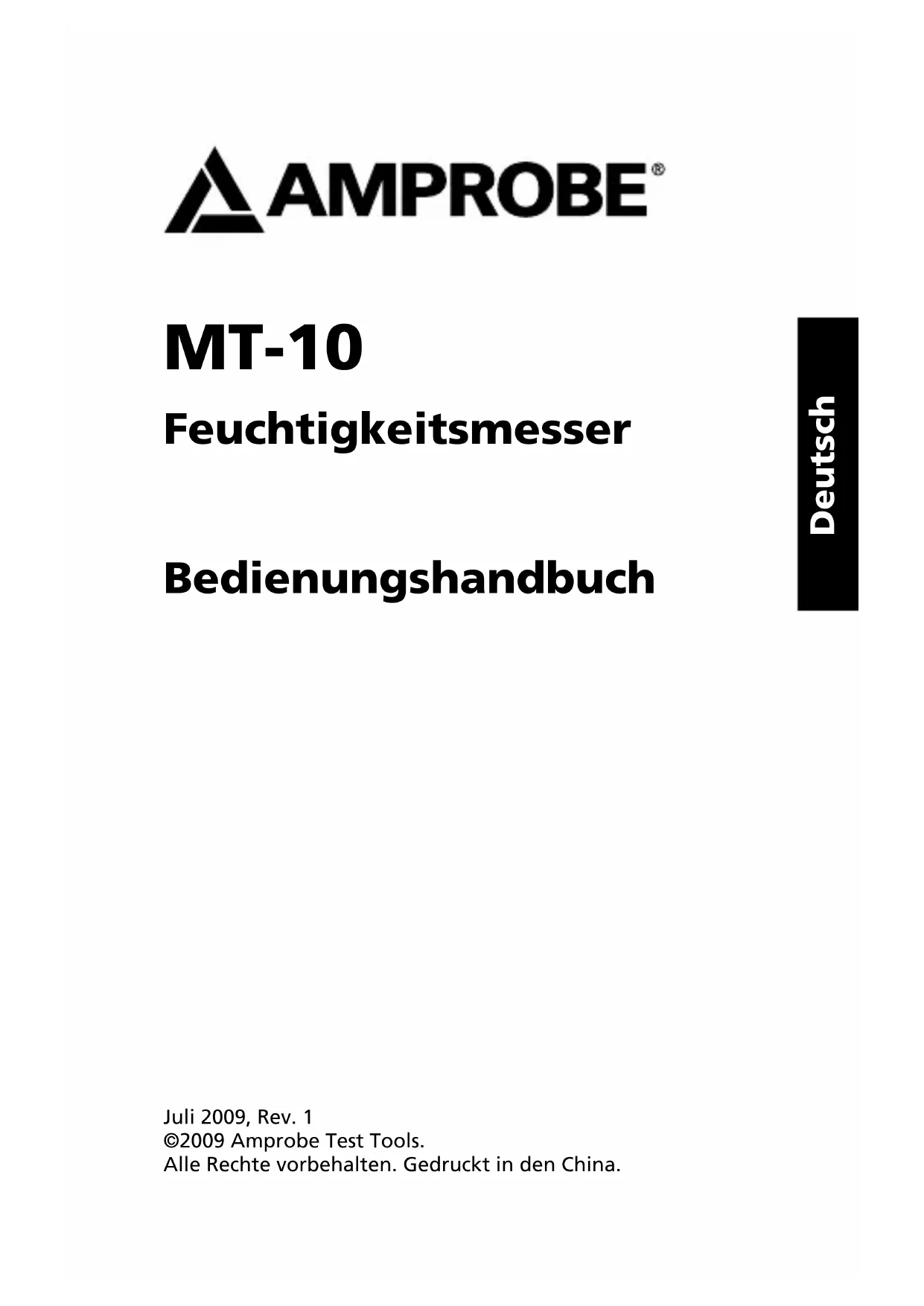 un déclic. L’hygromètre est maintenant prêt à être utilisé.MT-10 Feuchtigkeitsmesser Bedienungshandbuch Juli 2009, Rev. 1 ©2009 Amprobe Test Tools. Alle Rechte vorbehalten. Gedruckt in den China. DeutschBeschränkte Gewährleistung und Haftungsbeschränkung Es wird gewährleistet, dass dieses Amprobe-Produkt für die Dauer von einem Jahr ab dem Kaufdatum frei von Material- und Fertigungsdefekten ist. Diese Gewährleistung erstreckt sich nicht auf Sicherungen, Einwegbatterien oder Schäden durch Unfälle, Nachlässigkeit, Missbrauch, Änderungen oder abnormale Betriebsbedingungen bzw. unsachgemäße Handhabung. Die Verkaufsstellen sind nicht dazu berechtigt, diese Gewährleistung im Namen von Amprobe zu erweitern. Um während der Gewährleistungsperiode Serviceleistungen in Anspruch zu nehmen, das Produkt mit Kaufnachweis an ein autorisiertes Amprobe Test Tools Service-Center oder an einen Amprobe- Fachhändler/-Distributor einsenden. Nähere Einzelheiten siehe Abschnitt „Reparatur“. DIESE GEWÄHRLEISTUNG