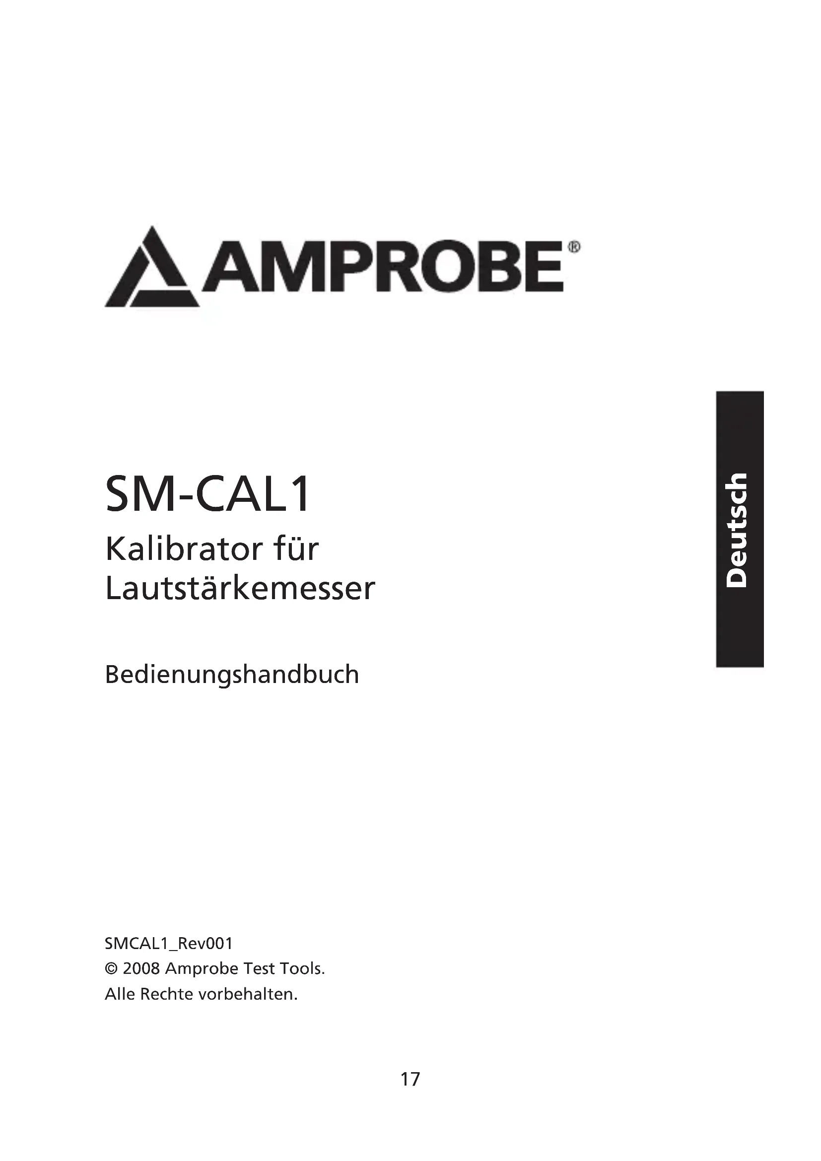 SM-CAL1 POWER 94 114 OFF1617 Deutsch SM-CAL1 Kalibrator für Lautstärkemesser Bedienungshandbuch SMCAL1_Rev001© 2008 Amprobe Test Tools.Alle Rechte vorbehalten.18 Beschränkte Gewährleistung und Haftungsbeschränkung Es wird gewährleistet, dass dieses Amprobe-Produkt für die Dauer von einem Jahr ab dem Kaufdatum frei von Material- und Fertigungsdefekten ist. Diese Gewährleistung erstreckt sich nicht auf Sicherungen, Einwegbatterien oder Schäden durch Unfälle, Nachlässigkeit, Missbrauch, Änderungen oder abnormale Betriebsbedingungen bzw. unsachgemäße Handhabung. Die Verkaufsstellen sind nicht dazu berechtigt, diese Gewährleistung im Namen von Amprobe zu erweitern. Um während der Gewährleistungsperiode Serviceleistungen in Anspruch zu nehmen, das Produkt mit Kaufnachweis an ein autorisiertes Amprobe Test Tools Service-Center oder an einen Amprobe-Fachhändler/-Distributor einsenden. Nähere Einzelheiten siehe Abschnitt „Reparatur“. DIESE GEWÄHRLEISTUNG STELLT DEN EINZIGEN UND ALLEINIGEN RECHTSANSPRUCH AUF SCHADENERSATZ DAR. ALLE ANDEREN GEWÄHRLEISTUNGEN, VERTRAGLICH GEREGELTE ODER GESETZLICHE VORGESCHRIEBENE, EINSCHLIESSLICH DER GESETZLICHEN GEWÄHRLEISTUNG DER MARKTFÄHIGKEIT UND DER EIGNUNG FÜR EINEN BESTIMMTEN ZWECK, WERDEN ABGELEHNT. DER HERSTELLER ÜBERNIMMT KEINE HAFTUNG FÜR SPEZIELLE, INDIREKTE, NEBEN- ODER FOLGESCHÄDEN ODER FÜR VERLUSTE, DIE AUF BELIEBIGER URSACHE ODER RECHTSTHEORIE BERUHEN. Weil einige Staaten oder Länder den Ausschluss oder die Einschränkung einer implizierten Gewährleistung sowie den Ausschluss von Begleit- oder Folgeschäden nicht zulassen, ist diese Gewährleistungsbeschränkung möglicherweise für Sie nicht gültig. Reparatur Allen Geräten, die innerhalb oder außerhalb des Garantiezeitraums zur Reparatur oder Kalibrierung eingesendet werden, müssen mit folgenden Informationen und Dokumenten versehen werden: Name des Kunden, Firmenname, Adresse, Telefonnummer und Kaufbeleg. Zusätzlich bitte dem Messgerät eine kurze Beschreibung des Problems oder der gewünschten Wartung sowie die Messleitungen beilegen. Die Gebühren für außerhalb des Garantiezeitraums durchgeführte Reparaturen oder für den Ersatz von Instrumenten müssen per Scheck, Zahlungsan- weisung oder Kreditkarte (Kreditkartennummer mit Ablaufdatum) beglichen werden oder es muss ein Auftrag auf Rechnung an Amprobe