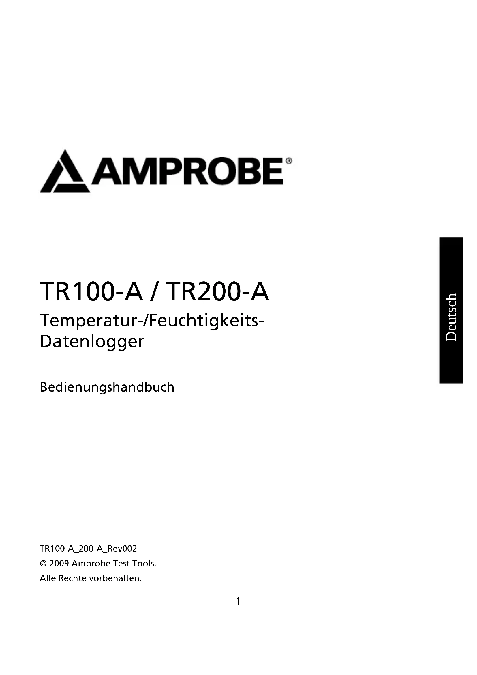 Code d’erreur Description E01 La sonde est débranchée E02 La valeur est en deçà de la limite inférieure E03 La valeur est au-delà de la limite supérieure E04 La valeur échoue en raison de l’erreur des données initiales relatives. E11 Erreur d’étalonnage HR La précision du capteur d’humidité ne peut pas être étalonnée par l’utilisateur final en raison des exigences spéciales du matériel. Veuillez contacter un laboratoire d’étalonnage qualifié pour ce service. E32 Erreur de lecture/écriture EEPROM E33 Erreur matérielle1 Deutsch TR100-A / TR200-A Temperatur-/Feuchtigkeits- Datenlogger Bedienungshandbuch TR100-A_200-A_Rev002© 2009 Amprobe Test Tools.Alle Rechte vorbehalten.2 Beschränkte Gewährleistung und Haftungsbeschränkung Es wird gewährleistet, dass dieses Amprobe-Produkt für die Dauer von einem Jahr ab dem Kaufdatum frei von Material- und Fertigungsdefekten ist. Diese Gewährleistung erstreckt sich nicht auf Sicherungen, Einwegbatterien oder Schäden durch Unfälle, Nachlässigkeit, Missbrauch, Änderungen oder abnormale Betriebsbedingungen bzw. unsachgemäße Handhabung. Die Garantieverpflichtung von Amprobe beschränkt sich darauf, dass Amprobe nach eigenem Ermessen den Kaufpreis ersetzt oder aber das defekte Produkt unentgeltlich repariert oder austauscht. Die Verkaufsstellen sind nicht dazu berechtigt, diese Gewährleistung im Namen von Amprobe zu erweitern. Um während der Gewährleistungsperiode Serviceleistungen zu beanspruchen, das Produkt mit Kaufnachweis an ein autorisiertes Amprobe Test Tools Service-Center oder an einen Amprobe-Fachhändler/-Distributor einsenden. Nähere Einzelheiten siehe Abschnitt „Reparatur“. DIESE GEWÄHRLEISTUNG STELLT DEN EINZIGEN UND ALLEINIGEN RECHTSANSPRUCH AUF SCHADENERSATZ DAR. ALLE ANDEREN GEWÄHRLEISTUNGEN, VERTRAGLICH GEREGELTE ODER GESETZLICH VORGESCHRIEBENE, EINSCHLIESSLICH DER GESETZLICHEN GEWÄHRLEISTUNG DER MARKTFÄHIGKEIT UND DER EIGNUNG FÜR EINEN BESTIMMTEN ZWECK, WERDEN ABGELEHNT. WEDER AMPROBE NOCH DESSEN MUTTERGESELLSCHAFT ODER TOCHTERGESELLSCHAFTEN ÜBERNEHMEN HAFTUNG FÜR SPEZIELLE, INDIREKTE, NEBEN- ODER FOLGESCHÄDEN ODER FÜR VERLUSTE, DIE AUF BELIEBIGER URSACHE ODER RECHTSTHEORIE BERUHEN. Weil einige Staaten oder Länder den Ausschluss oder die Einschränkung einer implizierten Gewährleistung sowie den Ausschluss von Begleit- oder Folgeschäden nicht zulassen, ist diese Gewährleistungsbeschränkung möglicherweise für Sie nicht gültig. Reparatur Alle Geräten, die innerhalb oder außerhalb des Garantiezeitraums zur Reparatur oder Kalibrierung eingesendet werden, müssen mit folgenden Informationen und Dokumenten versehen werden: Name des Kunden, Firmenname, Adresse, Telefonnummer und Kaufbeleg. Zusätzlich bitte dem Messgerät eine kurze Beschreibung des Problems oder der gewünschten Wartung sowie die Messleitungen beilegen. Die Gebühren für Reparaturen außerhalb der Garantie oder für den Ersatz von Instrumenten müssen per Scheck, Geldanweisung oder Kreditkarte (Kreditkartennummer mit Ablaufdatum) beglichen werden oder es muss ein Auftrag an Amprobe