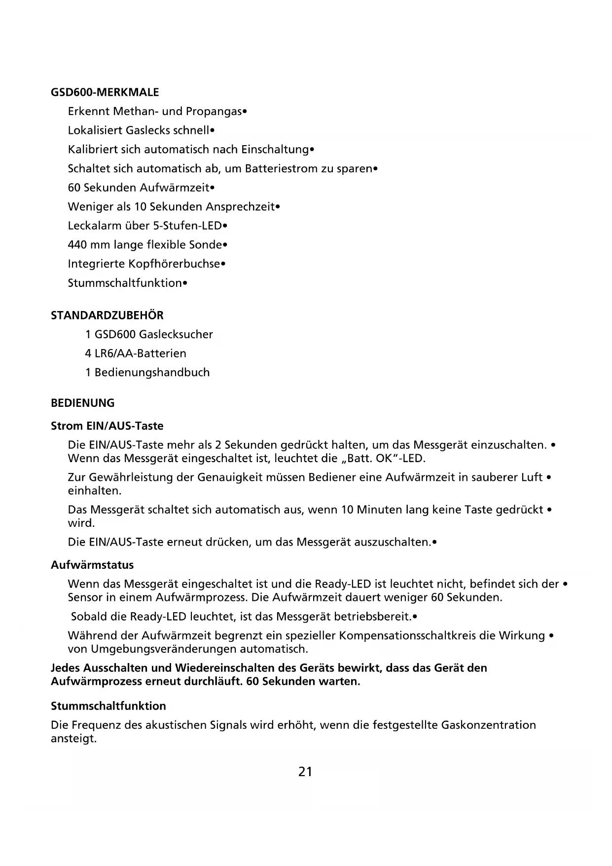 - Spezifikationen GSD600-MERKMALE Erkennt Methan- und Propangas• Lokalisiert Gaslecks schnell• Kalibriert sich automatisch nach Einschaltung• Schaltet sich automatisch ab, um Batteriestrom zu sparen• 60 Sekunden Aufwärmzeit• Weniger als 10 Sekunden Ansprechzeit• Leckalarm über 5-Stufen-LED• 440 mm lange flexible Sonde• Integrierte Kopfhörerbuchse• Stummschaltfunktion• STANDARDZUBEHÖR 1 GSD600 Gaslecksucher 4 LR6/AA-Batterien 1 Bedienungshandbuch BEDIENUNG Strom EIN/AUS-Taste Die EIN/AUS-Taste mehr als 2 Sekunden gedrückt halten, um das Messgerät einzuschalten. • Wenn das Messgerät eingeschaltet ist, leuchtet die „Batt. OK“-LED. Zur Gewährleistung der Genauigkeit müssen Bediener eine Aufwärmzeit in sauberer Luft • einhalten. Das Messgerät schaltet sich automatisch aus, wenn 10 Minuten lang keine Taste gedrückt • wird. Die EIN/AUS-Taste erneut drücken, um das Messgerät auszuschalten.• Aufwärmstatus Wenn das Messgerät eingeschaltet ist und die Ready-LED ist leuchtet nicht, befindet sich der • Sensor in einem Aufwärmprozess. Die Aufwärmzeit dauert weniger 60 Sekunden. Sobald die Ready-LED leuchtet, ist das Messgerät betriebsbereit.• Während der Aufwärmzeit begrenzt ein spezieller Kompensationsschaltkreis die Wirkung • von Umgebungsveränderungen automatisch. Jedes Ausschalten und Wiedereinschalten des Geräts bewirkt, dass das Gerät den Aufwärmprozess erneut durchläuft. 60 Sekunden warten. Stummschaltfunktion Die Frequenz des akustischen Signals wird erhöht, wenn die festgestellte Gaskonzentration ansteigt.22 Wenn das Messgerät mit einem Kopfhörer verwendet wird, ist das Gerät automatisch stummgeschaltet, und der Bediener kann das akustische Signal über den Kopfhörer wahrnehmen. Der Kopfhörer gehört nicht zum Lieferumfang des GSD600. Ein Standardkopfhörer funktioniert mit diesem Gerät. Wenn der Kopfhörer nicht verwendet wird, kann der Bediener das akustische Signal durch Umschalten in die Position ON stummschalten. Dem Bediener stehen dann die LEDs (ohne akustisches Signal) als Anzeiger zur Verfügung. Leckprüfung Prüfen auf Rohrlecks: Den Sensor gegen das Rohr richten und das Messgerät langsam näher an das Rohr bringen. Das Verfahren auf der gegenüberliegenden Seite des Rohrs wiederholen. Wenn sich der Sensor im Bereich eines Lecks befindet, beginnt die LED zu leuchten und die Frequenz des akustischen Signals steigt an. Der Sensor erfordert nach jeder Leckerkennung 2 Minuten zur Wiederherstellung. p. 721