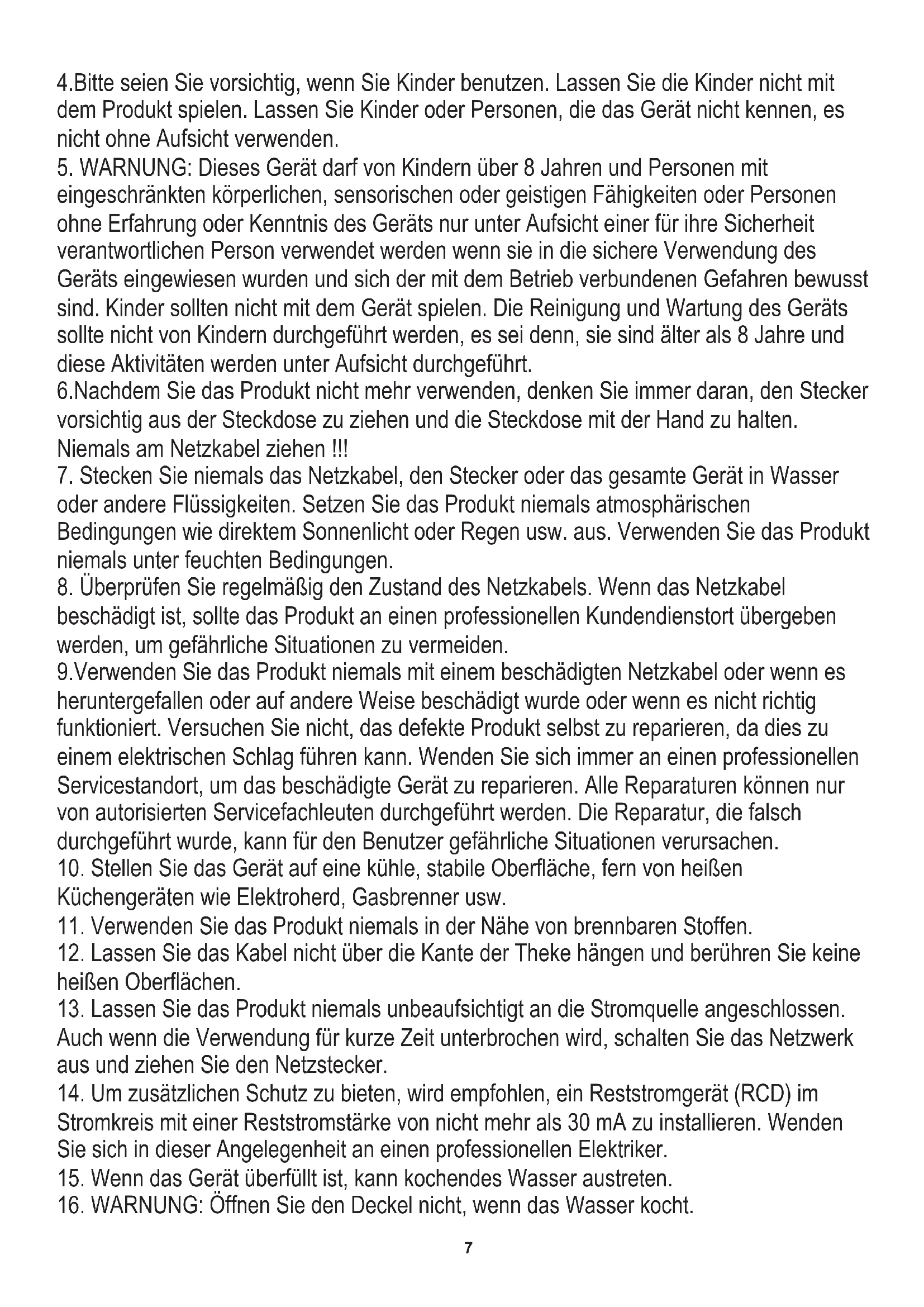 eingeschränkten körperlichen, sensorischen oder geistigen Fähigkeiten oder Personen ohne Erfahrung oder Kenntnis des Geräts nur unter Aufsicht einer für ihre Sicherheit verantwortlichen Person verwendet werden wenn sie in die sichere Verwendung des Geräts eingewiesen wurden und sich der mit dem Betrieb verbundenen Gefahren bewusst sind. Kinder sollten nicht mit dem Gerät spielen. Die Reinigung und Wartung des Geräts sollte nicht von Kindern durchgeführt werden, es sei denn, sie sind älter als 8 Jahre und diese Aktivitäten werden unter Aufsicht durchgeführt. 6.Nachdem Sie das Produkt nicht mehr verwenden, denken Sie immer daran, den Stecker vorsichtig aus der Steckdose zu ziehen und die Steckdose mit der Hand zu halten. Niemals am Netzkabel ziehen !!! 4.Bitte seien Sie vorsichtig, wenn Sie Kinder benutzen. Lassen Sie die Kinder nicht mit dem Produkt spielen. Lassen Sie Kinder oder Personen, die das Gerät nicht kennen, es nicht ohne Aufsicht verwenden.
