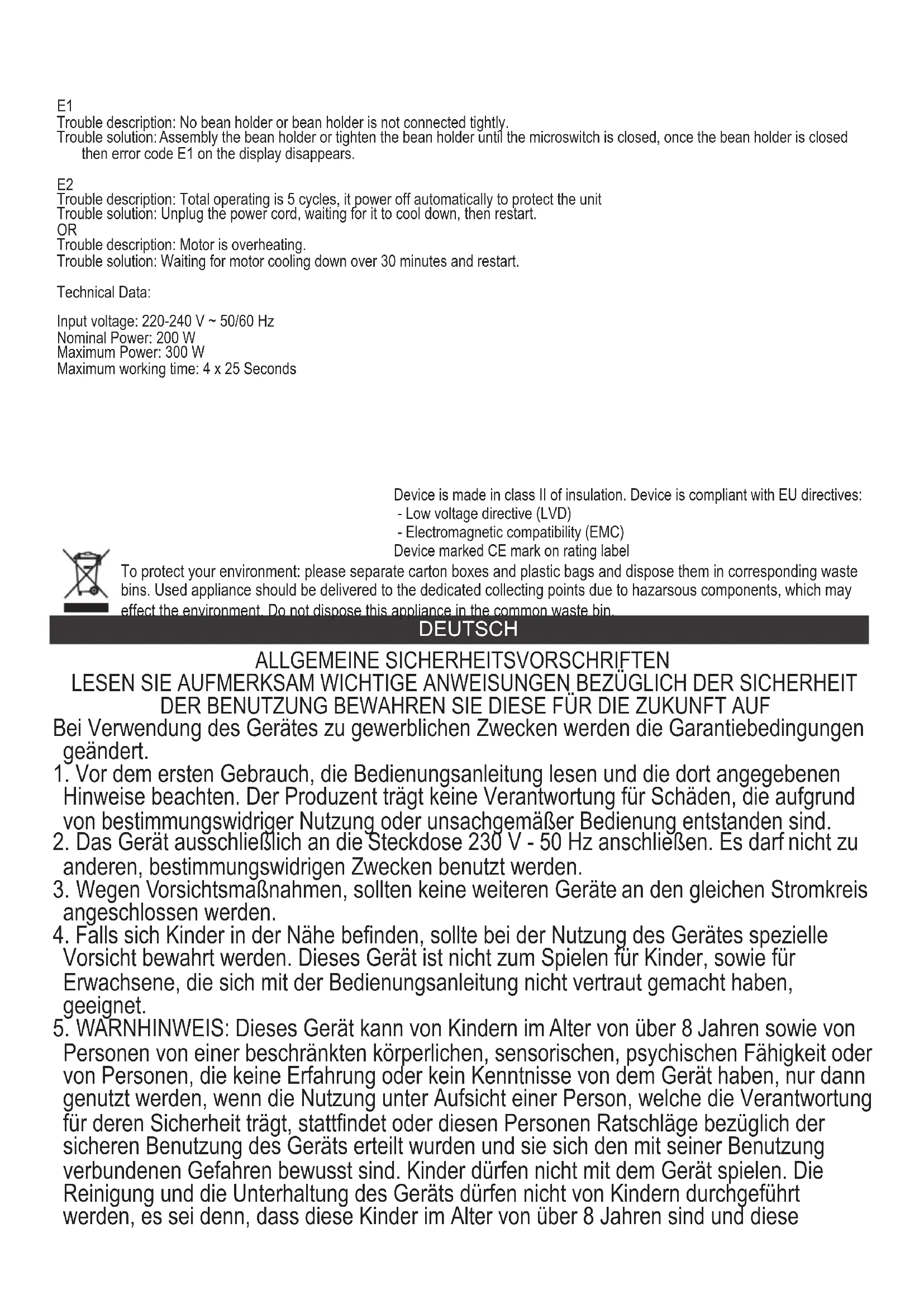 Fehlerbeschreibung: Der Gesamtbetrieb beträgt 5 Zyklen. Zum Schutz des Geräts wird das Gerät automatisch ausgeschaltet Problemlösung: Ziehen Sie das Netzkabel ab, warten Sie, bis es abgekühlt ist, und starten Sie es neu. ODER Fehlerbeschreibung: Motor überhitzt. Problemlösung: Warten Sie über 30 Minuten, bis der Motor abgekühlt ist, und starten Sie ihn neu. Technische Daten: Eingangsspannung: 220-240 V ~ 50/60 Hz Nennleistung: 200 W. Maximale Leistung: 300 W. Maximale Arbeitszeit: 4 x 25 SekundenDen Pappkarton im Altpapier entsorgen. Polyäthylenbeutel (PE) in dem Behälter für Kunststoff entsorgen. Das abgenutzte Gerät zum Recycling zu einer offiziellen Sammelstelle bringen, da es gefährliche Substanzen enthält, die die Umwelt gefährden können. Das Gerät sollte in einer Form abgegeben werden, die eine weitere Nutzung unmöglich macht. Wenn es Batterien enthält, sollten diese rausgenommen und separat an einer Sammelstelle abgegeben werden. Das Gerät darf nicht in den Hausmüll rausgeworfen werden!! Das Gerät wurde in der zweiten Isolationsklasse angefertigt, wodurch es keine Erdung erfordert. Das Gerät ist mit den Voraussetzungen folgender Richtlinien übereinstimmend. Elektrische Niedrigspannungsgeräte (LVD) Elektromagnetische Kompatibilität (EMC) Das Produkt mit CE auf dem Leistungsschild bezeichnet. FRANÇAIS CONSIGNES DE SECURITE. INSTRUCTIONS IMPORTANTES CONCERNANT LA SECURITE D'UTILISATION.