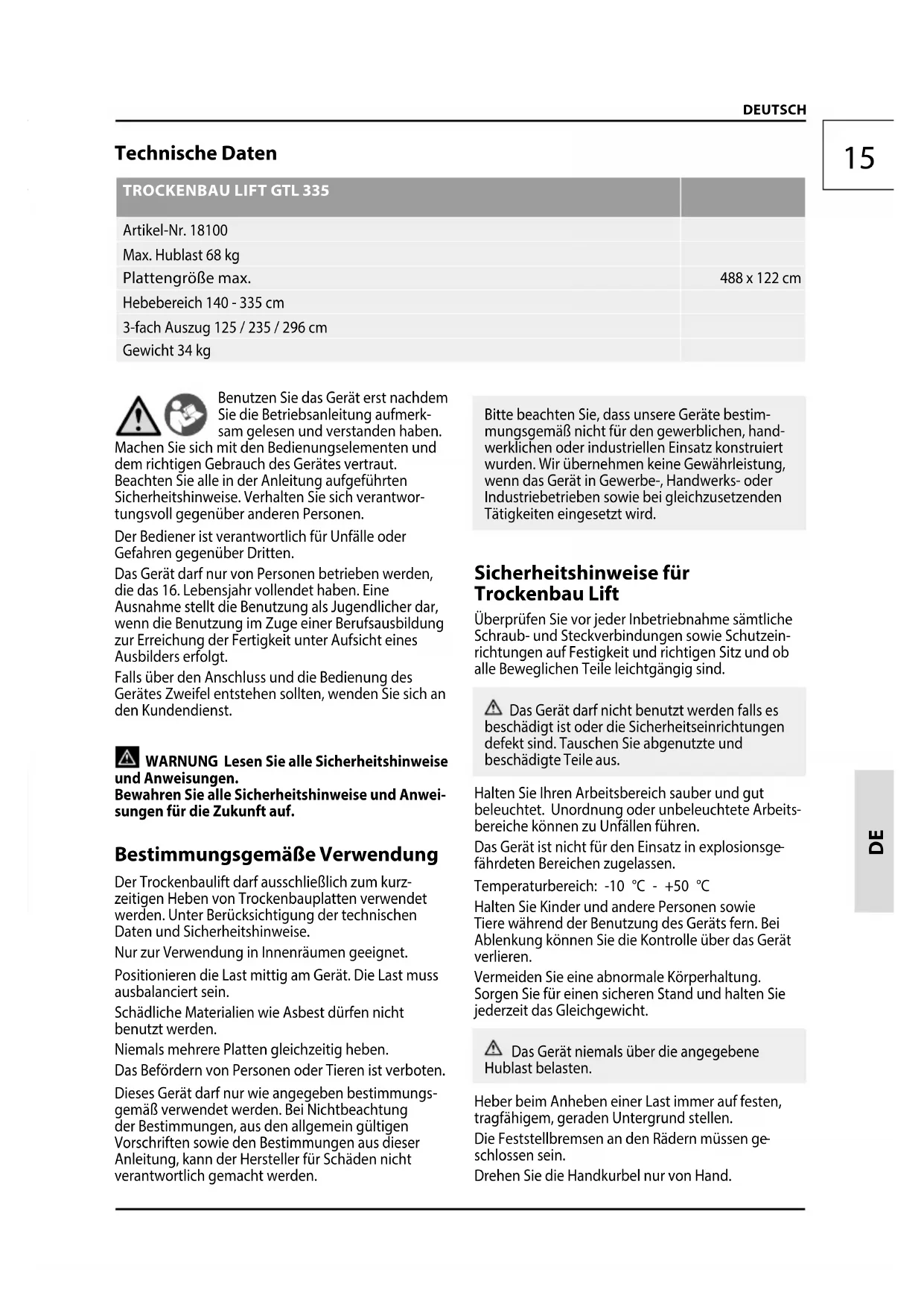 Artikel-Nr. 18100 Max. Hublast 68 kg Plattengröße max. 488 x 122 cm Hebebereich 140 - 335 cm 3-fach Auszug 125 / 235 / 296 cm Gewicht 34 kg Benutzen Sie das Gerät erst nachdem Sie die Betriebsanleitung aufmerk- sam gelesen und verstanden haben. Machen Sie sich mit den Bedienungselementen und dem richtigen Gebrauch des Gerätes vertraut. Beachten Sie alle in der Anleitung aufgeführten Sicherheitshinweise. Verhalten Sie sich verantwor- tungsvoll gegenüber anderen Personen. Der Bediener ist verantwortlich für Unfälle oder Gefahren gegenüber Dritten. Das Gerät darf nur von Personen betrieben werden, die das 16. Lebensjahr vollendet haben. Eine Ausnahme stellt die Benutzung als Jugendlicher dar, wenn die Benutzung im Zuge einer Berufsausbildung zur Erreichung der Fertigkeit unter Aufsicht eines Ausbilders erfolgt. Falls über den Anschluss und die Bedienung des Gerätes Zweifel entstehen sollten, wenden Sie sich an den Kundendienst. WARNUNG Lesen Sie alle Sicherheitshinweise und Anweisungen. Bewahren Sie alle Sicherheitshinweise und Anwei- sungen für die Zukunft auf. Bestimmungsgemäße Verwendung Der Trockenbaulift darf ausschließlich zum kurz- zeitigen Heben von Trockenbauplatten verwendet werden. Unter Berücksichtigung der technischen Daten und Sicherheitshinweise. Nur zur Verwendung in Innenräumen geeignet. Positionieren die Last mittig am Gerät. Die Last muss ausbalanciert sein. Schädliche Materialien wie Asbest dürfen nicht benutzt werden. Niemals mehrere Platten gleichzeitig heben. Das Befördern von Personenoder Tieren ist verboten. Dieses Gerät darf nur wie angegeben bestimmungs
