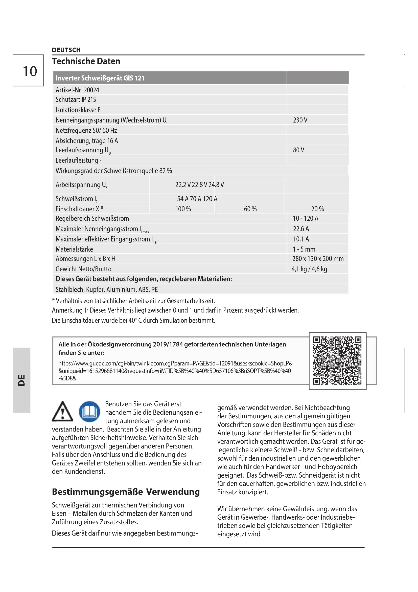 DEUTSCH Technische Daten Inverter Schweißgerät GIS 121 Artikel-Nr. 20024 Schutzart IP 21S Isolationsklasse F Nenneingangsspannung (Wechselstrom) U