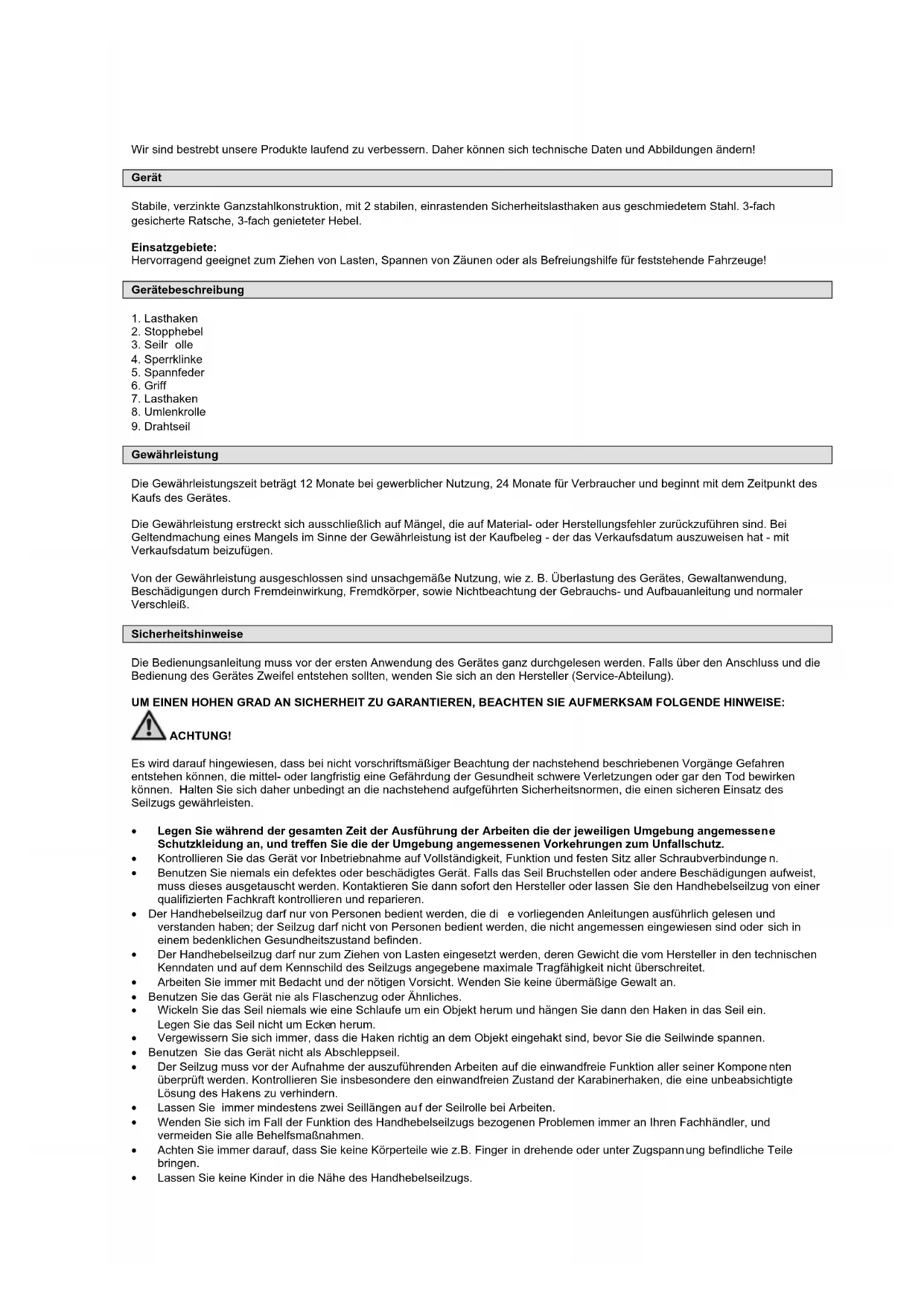 Gewährleistung Die Gewährleistungszeit beträgt 12 Monate bei gewerblicher Nutzung, 24 Monate für Verbraucher und beginnt mit dem Zeitpunkt des Kaufs des Gerätes. Die Gewährleistung erstreckt sich ausschließlich auf Mängel, die auf Material- oder Herstellungsfehler zurückzuführen sind. Bei Geltendmachung eines Mangels im Sinne der Gewährleistung ist der Kaufbeleg - der das Verkaufsdatum auszuweisen hat - mit Verkaufsdatum beizufügen. Von der Gewährleistung ausgeschlossen sind unsachgemäße Nutzung, wie z. B. Überlastung des Gerätes, Gewaltanwendung, Beschädigungen durch Fremdeinwirkung, Fremdkörper, sowie Nichtbeachtung der Gebrauchs- und Aufbauanleitung und normaler Verschleiß. Sicherheitshinweise Die Bedienungsa nleitung muss vor der ersten Anwendung des Gerätes ganz durchgelesen werden. Falls über den Anschluss und die Bedienung des Gerätes Zweifel entstehen sollten, wenden Sie sich an den Hersteller (Service-Abteilung). UM EINEN HOHEN GRAD AN SICHERHEIT ZU GARANTIEREN, BEACHTEN SIE AUFMERKSAM FOLGENDE HINWEISE: ACHTUNG! Es wird darauf hingewiesen, dass bei nicht vorschriftsmäßiger Beachtung der nachstehend beschriebenen Vorgänge Gefahren entstehen können, die mittel- oder langfristig eine Gefährdung der Gesundheit schwere Verletzungen oder gar den Tod bewirken können. Halten Sie sich daher unbedingt an die nachstehend aufgeführten Sicherheitsnormen, die einen sicheren Einsatz des Seilzugs gewährleisten. x Legen Sie während der gesamten Zeit der Ausführung der Arbeiten die der jeweiligen Umgebung angemessen
