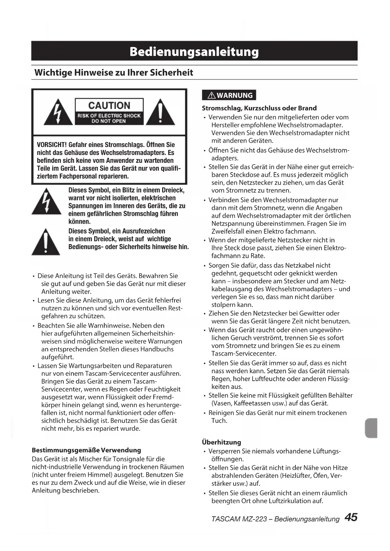 WARNUNG Stromschlag, Kurzschluss oder Brand• Verwenden Sie nur den mitgelieferten oder vom Hersteller empfohlene Wechselstromadapter. Verwenden Sie den Wechselstromadapter nicht mit anderen Geräten.• Öffnen Sie nicht das Gehäuse des Wechselstrom-adapters.• Stellen Sie das Gerät in der Nähe einer gut erreich-baren Steckdose auf. Es muss jederzeit möglich sein, den Netzstecker zu ziehen, um das Gerät vom Stromnetz zu trennen.• Verbinden Sie den Wechselstromadapter nur dann mit dem Stromnetz, wenn die Angaben auf dem Wechselstromadapter mit der örtlichen Netzspannung übereinstimmen. Fragen Sie im Zweifelsfall einen Elektro fachmann.• Wenn der mitgelieferte Netzstecker nicht in Ihre Steck dose passt, ziehen Sie einen Elektro-fachmann zu Rate.• Sorgen Sie dafür, dass das Netzkabel nicht gedehnt, gequetscht oder geknickt werden kann – insbesondere am Stecker und am Netz-kabelausgang des Wechselstromadapters – und verlegen Sie es so, dass man nicht darüber stolpern kann. • Ziehen Sie den Netzstecker bei Gewitter oder wenn Sie das Gerät längere Zeit nicht benutzen.• Wenn das Gerät raucht oder einen ungewöhn-lichen Geruch verströmt, trennen Sie es sofort vom Stromnetz und bringen Sie es zu einem Tascam-Servicecenter.• Stellen Sie das Gerät immer so auf, dass es nicht nass werden kann. Setzen Sie das Gerät niemals Regen, hoher Luftfeuchte oder anderen Flüssig-keiten aus.• Stellen Sie keine mit Flüssigkeit gefüllten Behälter (Vasen, Kaffeetassen usw.) auf das Gerät.• Reinigen Sie das Gerät nur mit einem trockenen Tuch.Überhitzung• Versperren Sie niemals vorhandene Lüftungs-öffnungen. • Stellen Sie das Gerät nicht in der Nähe von Hitze abstrahlenden Geräten (Heizlüfter, Öfen, Ver-stärker usw.) auf.• Stellen Sie dieses Gerät nicht an einem räumlich beengten Ort ohne Luftzirkulation auf. Bedienungsanleitung46 TASCAM MZ-223 – Bedienungsanleitung Falsches Zubehör