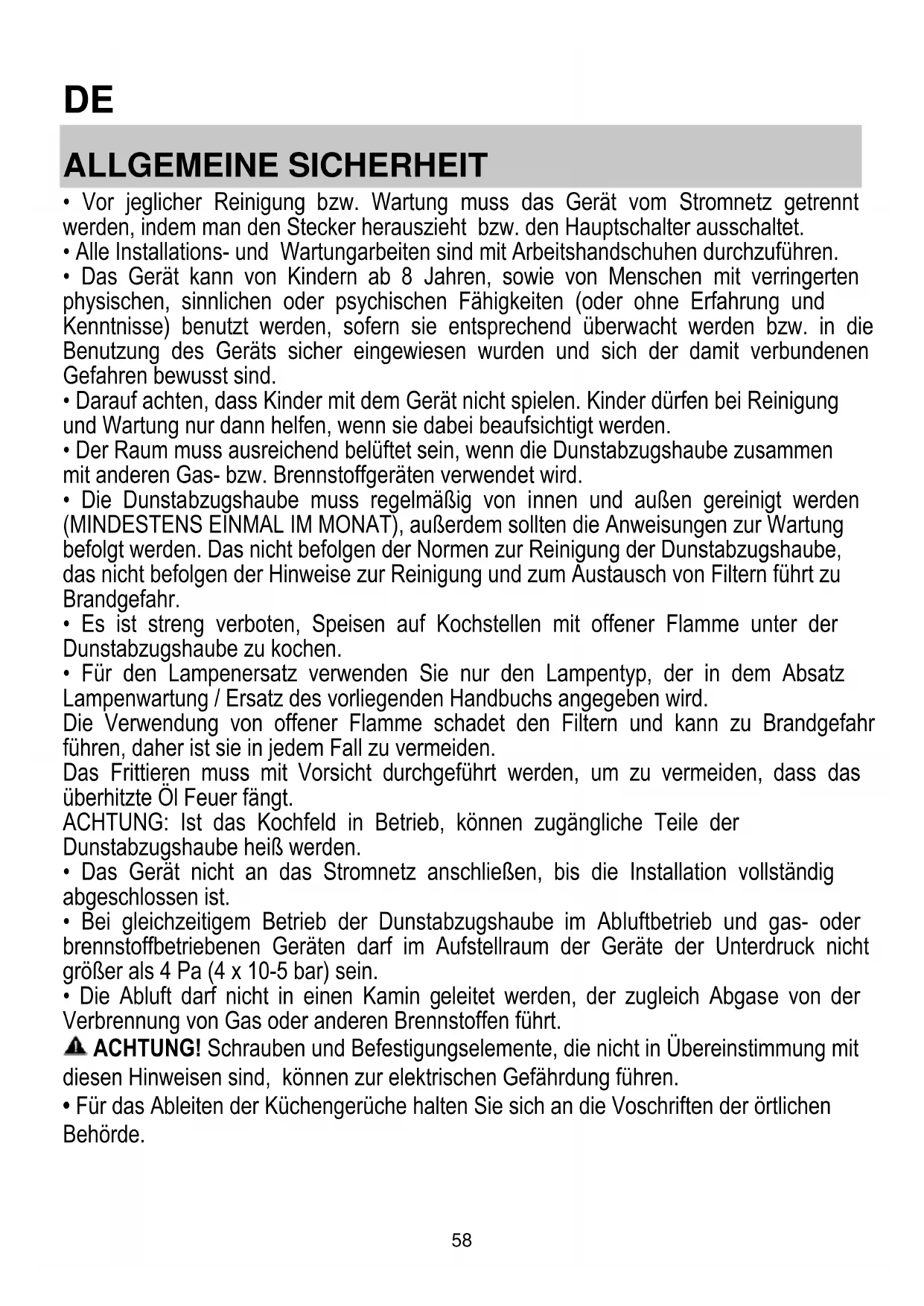 - Bei gleichzeitigem Betrieb der Dunstabzugshaube im Abluftbetrieb und gas- oder brennstoffbetriebenen Geräten darf im Aufstellraum der Geräte der Unterdruck nicht größer als 4 Pa (4 x 10-5 bar) sein.