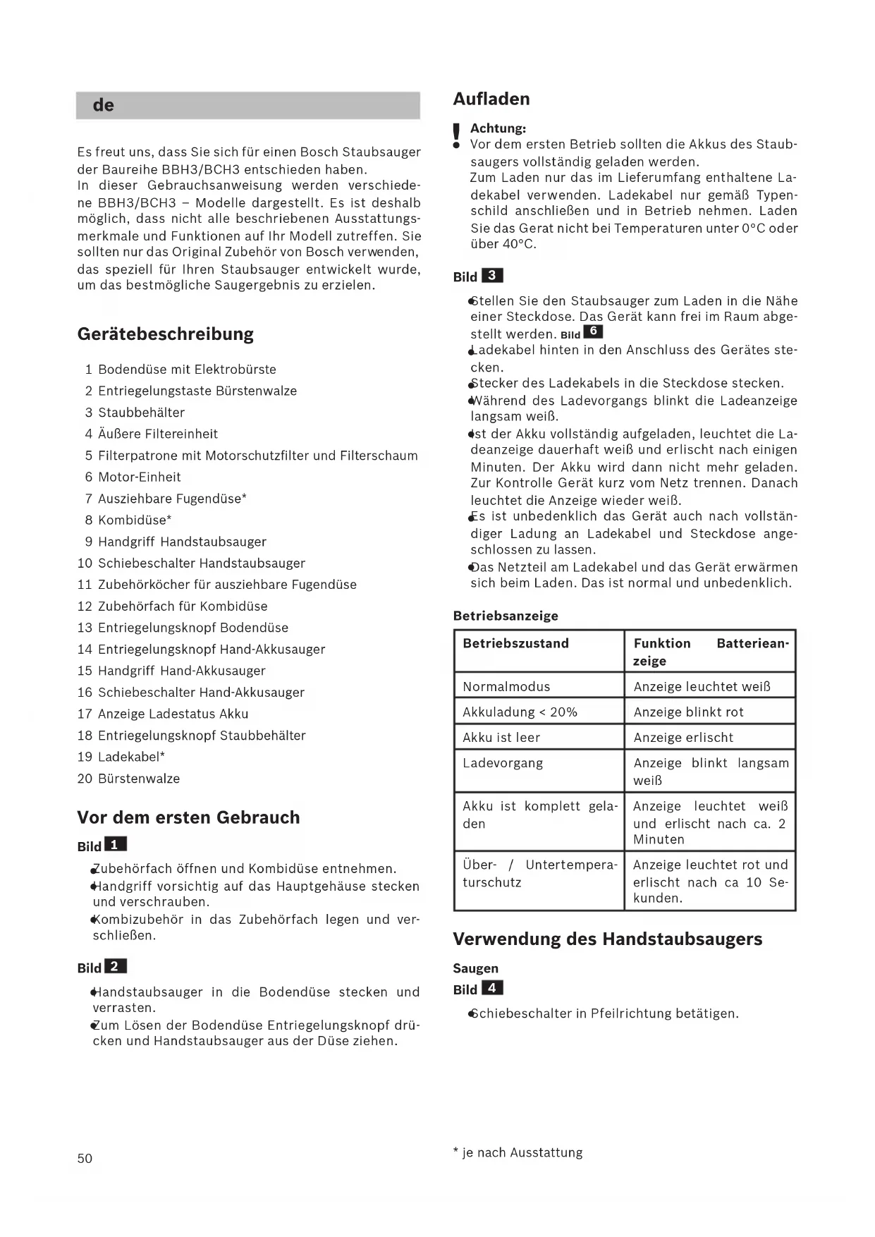 Es freut uns, dass Sie sich für einen Bosch Staubsauger der Baureihe BBH3/BCH3 entschieden haben. In dieser Gebrauchsanweisung werden verschiede- ne BBH3/BCH3 – Modelle dargestellt. Es ist deshalb möglich, dass nicht alle beschriebenen Ausstattungs- merkmale und Funktionen auf Ihr Modell zutreffen. Sie sollten nur das Original Zubehör von Bosch verw enden, das speziell für Ihre n Staubsauger entwickelt wurde, um das bestmögliche Saugergebnis zu erzielen. Gerätebeschreibung 1 Bodendüse mit Elektrobürste 2 Entriegelungstaste Bürstenwalze 3 Staubbehälter 4 Äußere Filtereinheit 5 Filterpatrone mit Motorschutzfilter und Filterschaum 6 Motor-Einheit 7 Ausziehbare Fugendüse* 8 Kombidüse* 9 Handgriff Handstaubsauger 10 Schiebeschalter Handstaubsauger 11 Zubehörköcher für ausziehbare Fugendüse 12 Zubehörfach für Kombidüse 13 Entrieg elungsknopf Bodendüse 14 Entriegelungsknopf Hand-Akkusauger 15 Handgriff Hand-Akkusauger 16 Schiebeschalter Hand-Akkusauger 17 Anzeige Ladestatus Akku 18 Entriegelungsknopf Staubbehälter 19 Ladekabel* 20 Bürstenwalze Vor dem ersten Gebrauch Bild