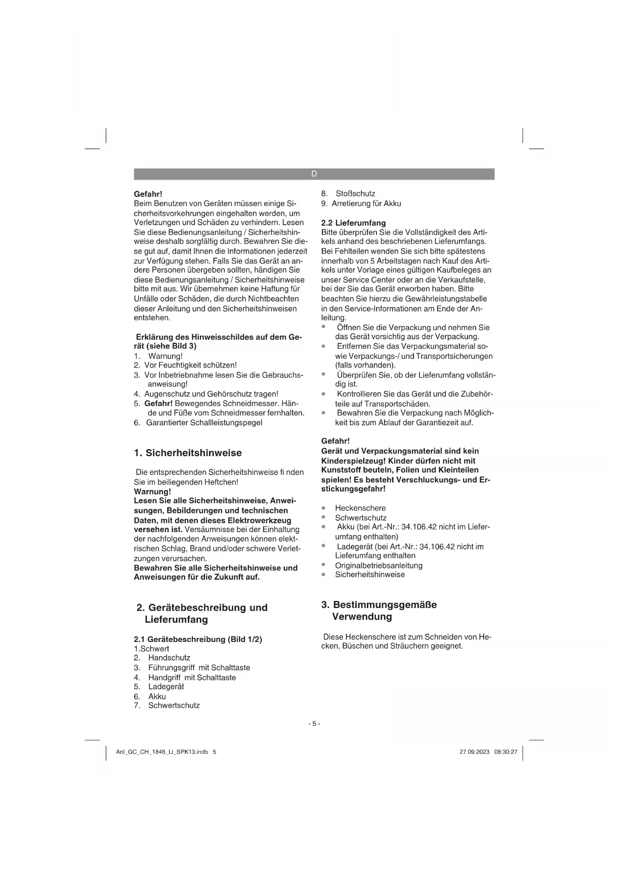 Verwendung Diese Heckenschere ist zum Schneiden von He- cken, Büschen und Sträuchern geeignet. Anl_GC_CH_1846_Li_SPK13.indb 5Anl_GC_CH_1846_Li_SPK13.indb 5 27.09.2023 08:30:2727.09.2023 08:30:27D