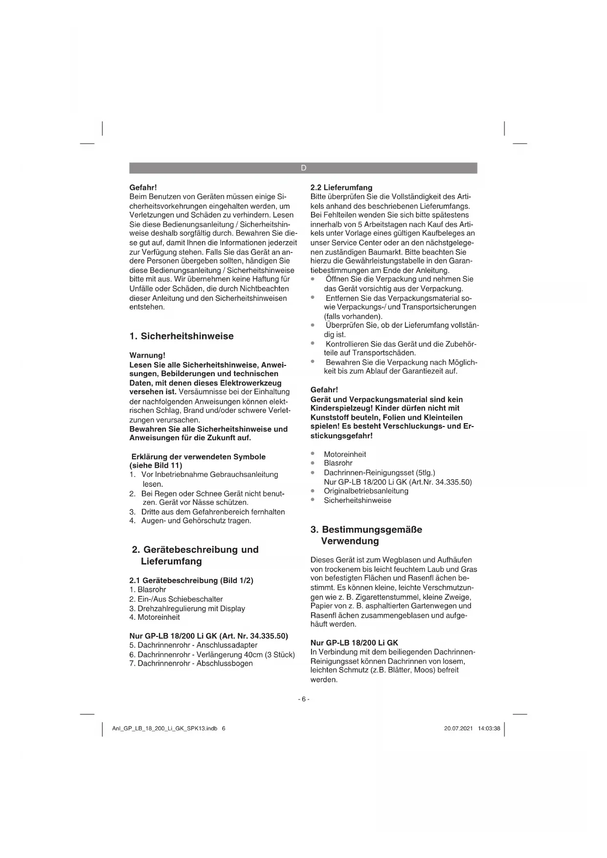 Verwendung Dieses Gerät ist zum Wegblasen und Aufhäufen von trockenem bis leicht feuchtem Laub und Gras von befestigten Flächen und Rasenfl ächen be- stimmt. Es können kleine, leichte Verschmutzun- gen wie z. B. Zigarettenstummel, kleine Zweige, Papier von z. B. asphaltierten Gartenwegen und Rasenfl ächen zusammengeblasen und aufge- häuft werden. Nur GP-LB 18/200 Li GK In Verbindung mit dem beiliegenden Dachrinnen- Reinigungsset können Dachrinnen von losem, leichten Schmutz (z.B. Blätter, Moos) befreit werden. Anl_GP_LB_18_200_Li_GK_SPK13.indb 6Anl_GP_LB_18_200_Li_GK_SPK13.indb 6 20.07.2021 14:03:3820.07.2021 14:03:38D