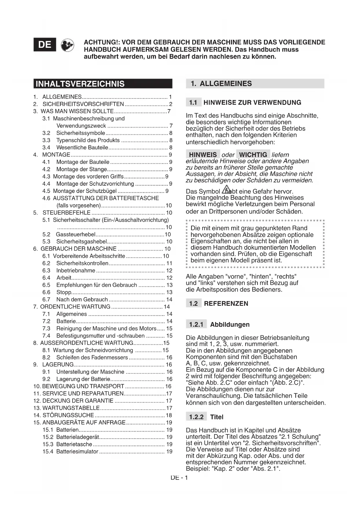UND VERWENDUNGSZWECK Diese Maschine ist ein Gartenbaugerät, genauer gesagt ein tragbarer Rasentrimmer/ Rasenkantenschneider mit Batteriebetrieb. Die Maschine besteht im Wesentlichen aus einem Motor, der mit einer Antriebswelle eine Schneidvorrichtung (Fadenkopf) betätigt. Die Schneidvorrichtung schneidet auf einer zum Boden ungefähr parallelen Ebene (bei Verwendung als Rasentrimmer) oder ungefähr senkrecht zum Boden (bei Verwendung als Kantenschneider). Der Bediener kann die Hauptbedienelemente immer in Sicherheitsabstand zur Schneidvorrichtung betätigen.