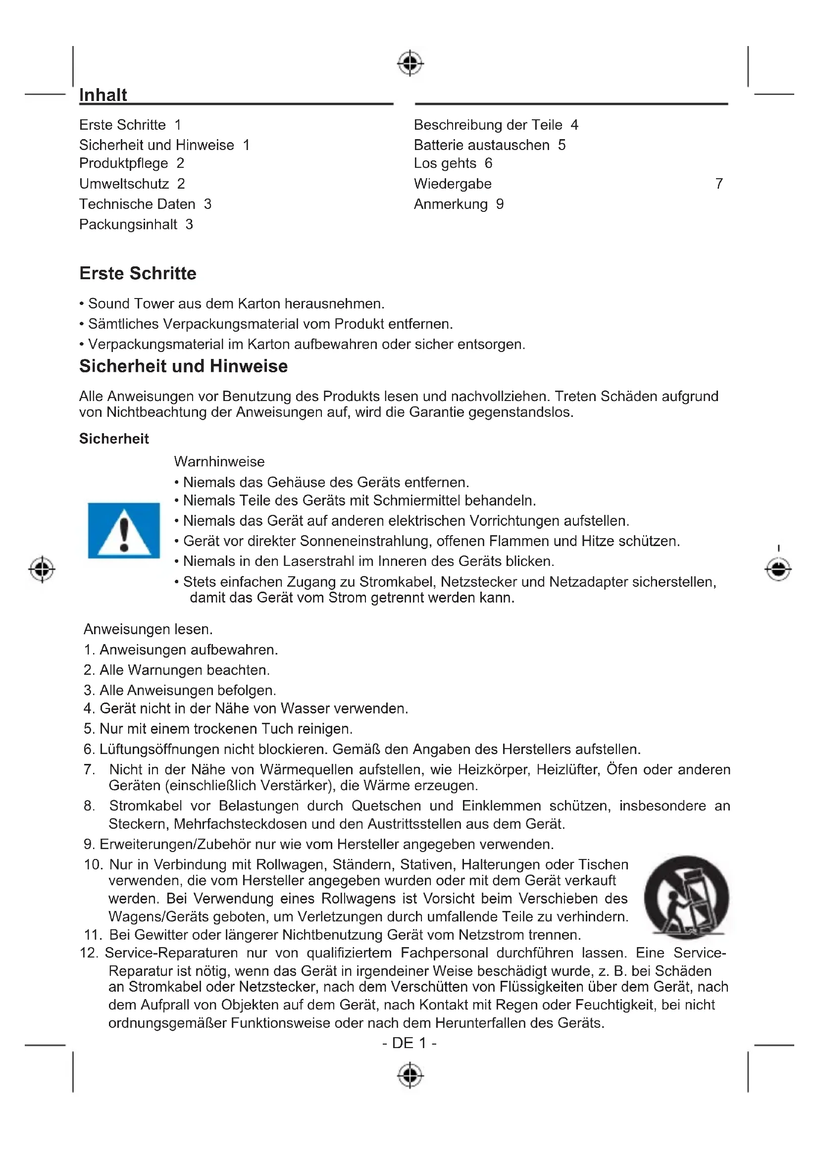 - Stets einfachen Zugang zu Stromkabel, Netzstecker und Netzadapter sicherstellen, damit das Gerät vom Strom getrennt werden kann. - DE 1 - Inhalt Erste Schritte 1 Sicherheit und Hinweise 1 Produktpege 2 Umweltschutz 2 Technische Daten 3 Packungsinhalt 3 Beschreibung der Teile 4 Batterie austauschen 5 Los gehts 6 Wiedergabe 7 Anmerkung 9 Anweisungen lesen.