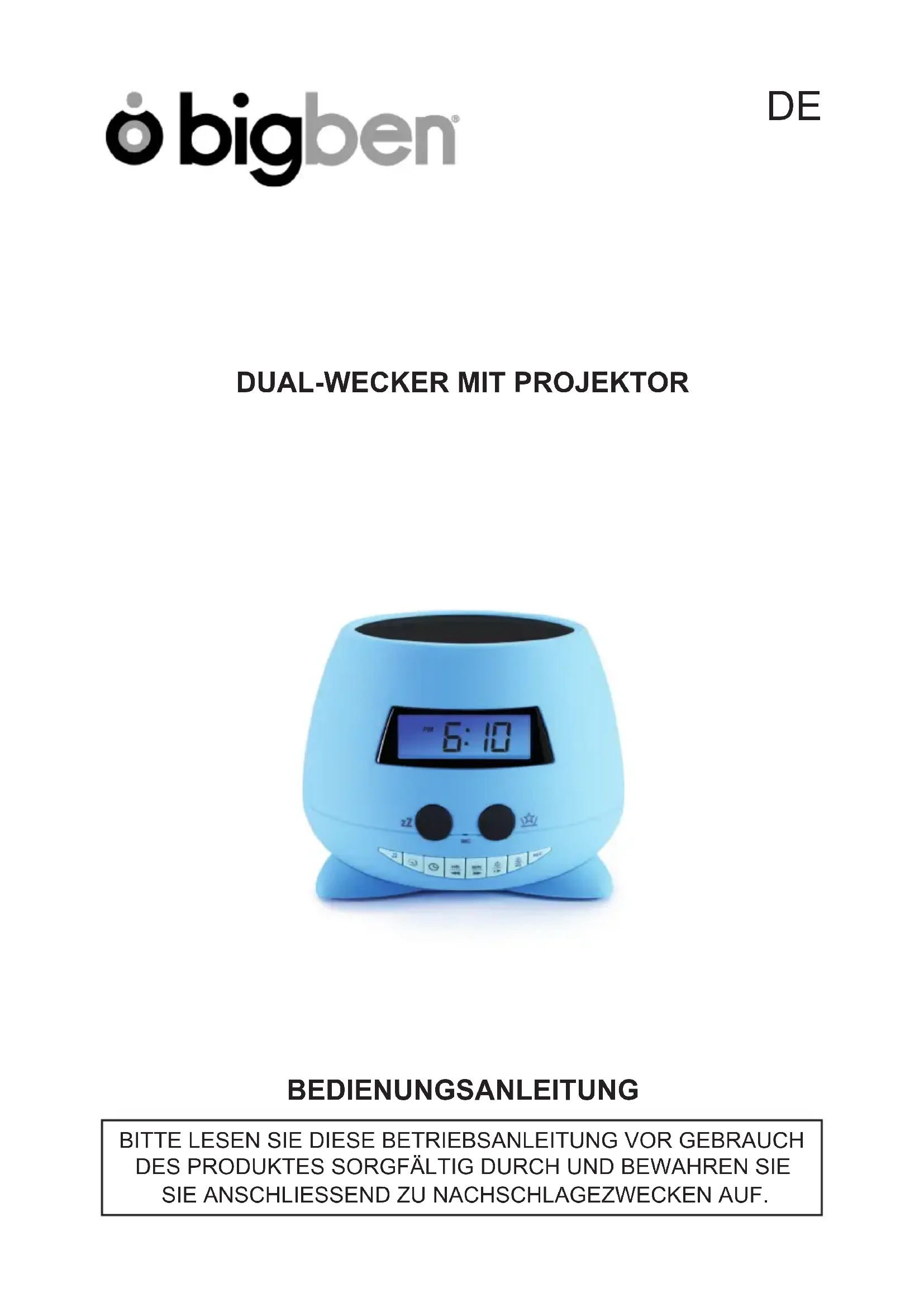 Apenas DC Pilhas:3pilhasalcalinasAALR06(nãoincluídas). CUIDADO: As pilhas só deverão ser colocadas por um adulto. Substitua as pilhas quando o som for reproduzido lentamente ou distorcido, ou quando a unidade funcionar erraticamente.DUAL-WECKER MIT PROJEKTOR BEDIENUNGSANLEITUNG BITTELESENSIEDIESEBETRIEBSANLEITUNGVORGEBRAUCH DESPRODUKTESSORGFÄLTIGDURCHUNDBEWAHRENSIE SIEANSCHLIESSENDZUNACHSCHLAGEZWECKENAUF. DE- DE 1 - Inhalt Erste Schritte 1 Sicherheit und Hinweise Sicherheit Produktpege 2 Umweltschutz Packungsinhalt 3 Batteriestrom Aufstellen Grundfunktionen Tastenfunktionen 4 Ton Ein/Aus 5 Lautstärke Einstellen der Uhrzeit Einstellen der Weckzeit BenutzungderSnooze-Funktion SCHLÄFCHEN-/Schlaf-Timer 6 Ton aufnehmen Projektor und LCD-Hintergrundbeleuchtung EIN/AUS GrundlegendetechnischeDaten 7 Anmerkung Erste Schritte