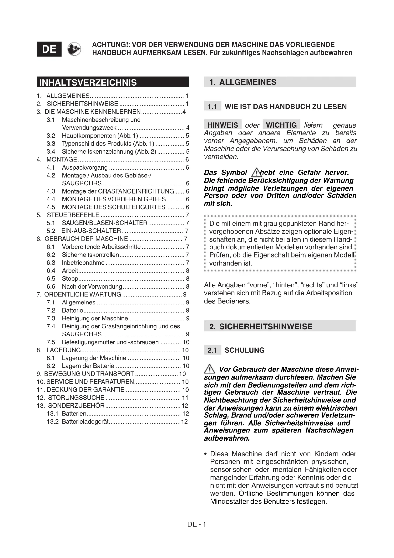 WICHTIG Die folgenden Sicherheitshinweise vervollständigen die Sicherheitsvorschriften im spezischen Handbuch der Batterie und des Batterieladegeräts, das der Maschine beigelegt ist.