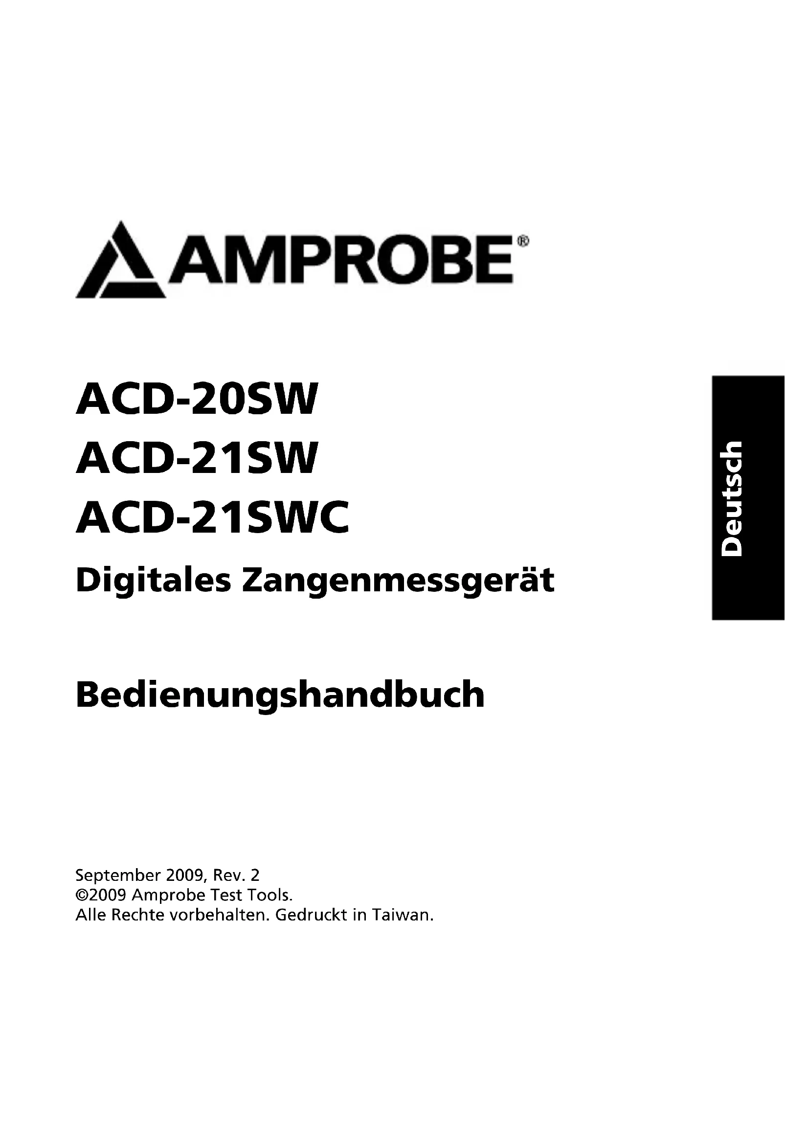 OFF OFF OFF OFF OFF OFF OFF OFF OFF OFF OFF OFF Fig. 7 Mesure de tension sans contact (NCV) Fig. 6 Mesure de température Fig. 5 Mesure de résistanceACD-20SW ACD-21SW ACD-21SWC Digitales Zangenmessgerät Bedienungshandbuch September 2009, Rev. 2 ©2009 Amprobe Test Tools. Alle Rechte vorbehalten. Gedruckt in Taiwan. DeutschBeschränkte Gewährleistung und Haftungsbeschränkung Es wird gewährleistet, dass dieses Amprobe-Produkt für die Dauer von einem Jahr ab dem Kaufdatum frei von Material- und Fertigungsdefekten ist. Diese Gewährleistung erstreckt sich nicht auf Sicherungen, Einwegbatterien oder Schäden durch Unfälle, Nachlässigkeit, Missbrauch, Änderungen oder abnormale Betriebsbedingungen bzw. unsachgemäße Handhabung. Die Verkaufsstellen sind nicht dazu berechtigt, diese Gewährleistung im Namen von Amprobe zu erweitern. Um während der Gewährleistungsperiode Serviceleistungen in Anspruch zu nehmen, das Produkt mit Kaufnachweis an ein autorisiertes Amprobe Test Tools Service- Center oder an einen Amprobe-Fachhändler/-Distributor einsenden. Nähere Einzelheiten siehe Abschnitt „Reparatur“. DIESE GEWÄHRLEISTUNG STELLT DEN EINZIGEN UND ALLEINIGEN RECHTSANSPRUCH AUF SCHADENERSATZ DAR. ALLE ANDEREN (VERTRAGLICH GEREGELTEN ODER GESETZLICH VORGESCHRIEBENEN) GEWÄHRLEISTUNGEN, EINSCHLIESSLICH DER GESETZLICHEN GEWÄHRLEISTUNG DER MARKTFÄHIGKEIT UND DER EIGNUNG FÜR EINEN BESTIMMTEN ZWECK, WERDEN ABGELEHNT. DER HERSTELLER ÜBERNIMMT KEINE HAFTUNG FÜR SPEZIELLE, INDIREKTE, NEBEN- ODER FOLGESCHÄDEN ODER FÜR VERLUSTE, DIE AUF BELIEBIGER URSACHE ODER RECHTSTHEORIE BERUHEN. Weil einige Staaten oder Länder den Ausschluss oder die Einschränkung einer implizierten Gewährleistung sowie den Ausschluss von Begleit- oder Folgeschäden nicht zulassen, ist diese Gewährleistungsbeschränkung möglicherweise für Sie nicht gültig. Reparatur Zu allen Geräten, die zur Reparatur oder Kalibrierung im Rahmen der Garantie oder außerhalb der Garantie eingesendet werden, muss folgendes beigelegt werden: Name des Kunden, Firmenname, Adresse, Telefonnummer und Kaufbeleg. Zusätzlich bitte eine kurze Beschreibung des Problems oder der gewünschten Wartung sowie die Messleitungen dem Messgerät beilegen. Die Gebühren für außerhalb des Garantiezeitraums durchgeführte Reparaturen oder für den Ersatz von Instrumenten müssen per Scheck, Zahlungsanweisung oder Kreditkarte (Kreditkartennummer mit Ablaufdatum) beglichen werden oder es muss ein Auftrag auf Rechnung an Amprobe