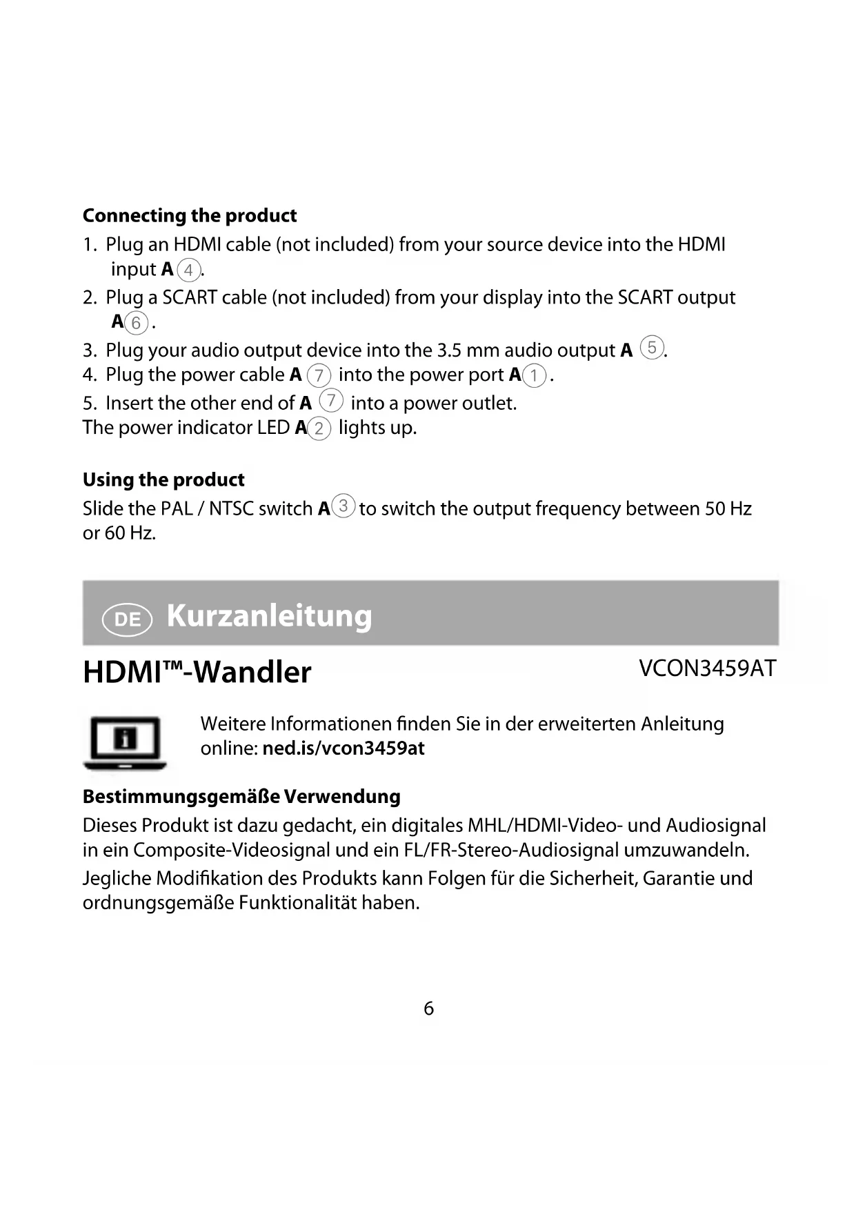 Kurzanleitung HDMI™-Wandler VCON3459AT Weitere Informationen nden Sie in der erweiterten Anleitung online: ned.is/vcon3459at Bestimmungsgemäße Verwendung Dieses Produkt ist dazu gedacht, ein digitales MHL/HDMI-Video- und Audiosignal in ein Composite-Videosignal und ein FL/FR-Stereo-Audiosignal umzuwandeln. Jegliche Modikation des Produkts kann Folgen für die Sicherheit, Garantie und ordnungsgemäße Funktionalität haben.7 Spezikationen Produkt HDMI™-Wandler Artikelnummer VCON3459AT Größe (L x B x H) 73 x 61 x 25 mm Gewicht 90 g HDMI-Eingang 640 x 480 @ 60 Hz 800 x 600 @ 60 Hz 1024 x 768 @ 60 Hz 1280 x 720 @ 60 Hz 1280 x 1024 @ 60 Hz 1360 x 768 @ 60 Hz 1600 x 1200 @ 60 Hz 1920 x 1080 @ 60 Hz 480i @ 60 Hz 480p @ 60 Hz 576i @ 60 Hz 576p @ 60 Hz 720p @ 60 Hz 1080i @ 60 Hz 1080p @ 60 Hz 4K @ 30 Hz SCART-Ausgang PAL / NTSC 480i / 576i @ 50 / 60 Hz Eingangsleistung 5 VDC ; 1 A Hauptbestandteile (Abbildung A) 1 Stromversorgungsanschluss 2 Betriebsanzeige-LED 3 PAL / NTSC-Umschalter 4 HDMI-Eingang 5 3,5 mm Audioausgang 6 SCART-Ausgang 7 Stromkabel Sicherheitshinweise