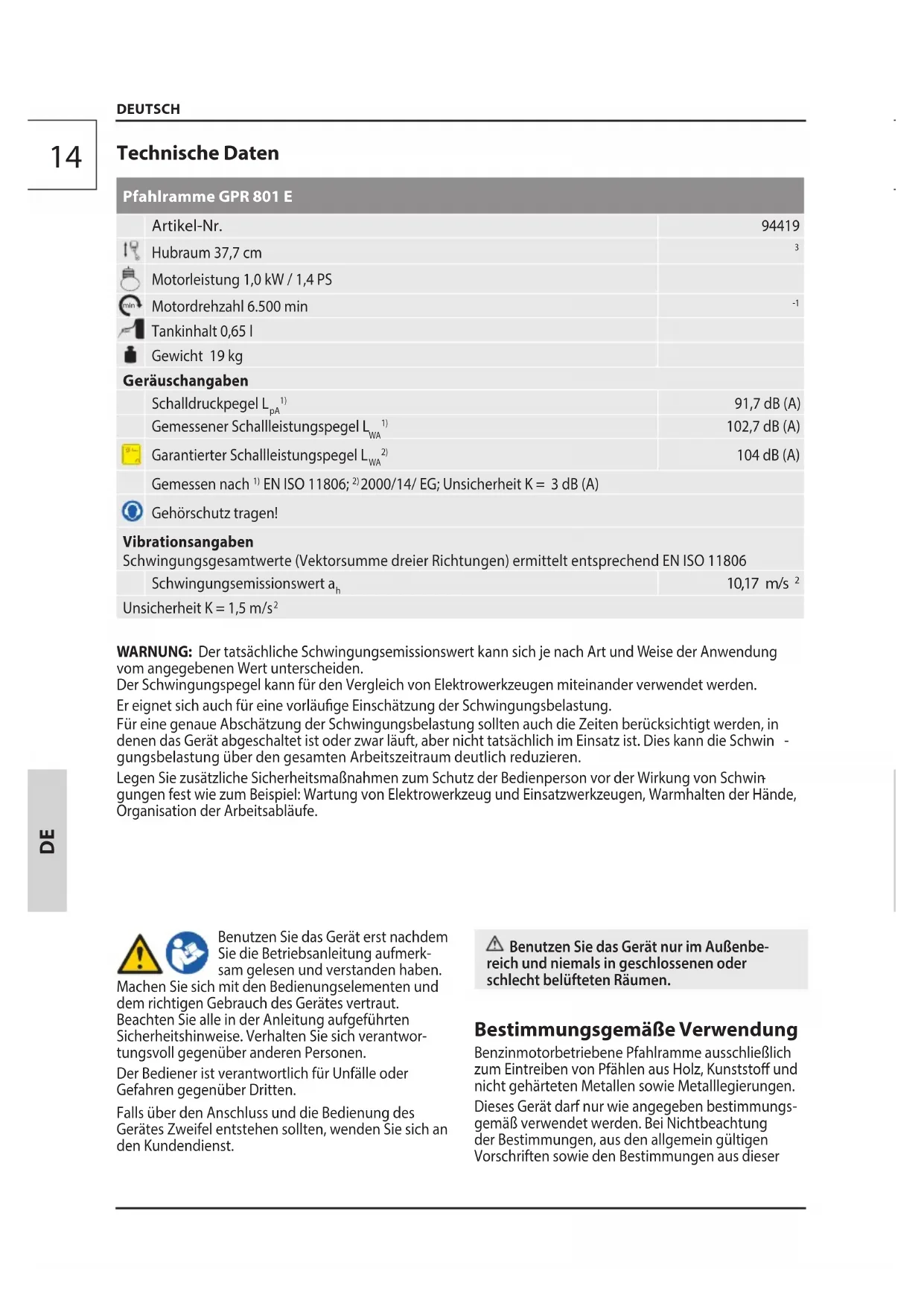gungen fest wie zum Beispiel: Wartung von Elektrowerkzeug und Einsatzwerkzeugen,Warmhalten der Hände, Organisation derArbeitsabläufe. DEUTSCH Benutzen Sie das Gerät erst nachdem Sie die Betriebsanleitung aufmerk- sam gelesen und verstanden haben. Machen Sie sich mit den Bedienungselementen und dem richtigen Gebrauch des Gerätes vertraut. Beachten Sie alle in der Anleitung aufgeführten Sicherheitshinweise. Verhalten Sie sich verantwor- tungsvoll gegenüber anderen Personen. Der Bediener ist verantwortlich für Unfälle oder Gefahren gegenüber Dritten. Falls über den Anschluss und die Bedienung des Gerätes Zweifel entstehen sollten, wenden Sie sich an den Kundendienst. Benutzen Sie das Gerät nur im Außenbe- reichund niemals in geschlossenen oder schlechtbelüfteten Räumen. Bestimmungsgemäße Verwendung Benzinmotorbetriebene Pfahlramme ausschließlich zum Eintreiben von Pfählen aus Holz, Kunststo und nicht gehärteten Metallen sowie Metalllegierungen. Dieses Gerät darf nur wie angegeben bestimmungs