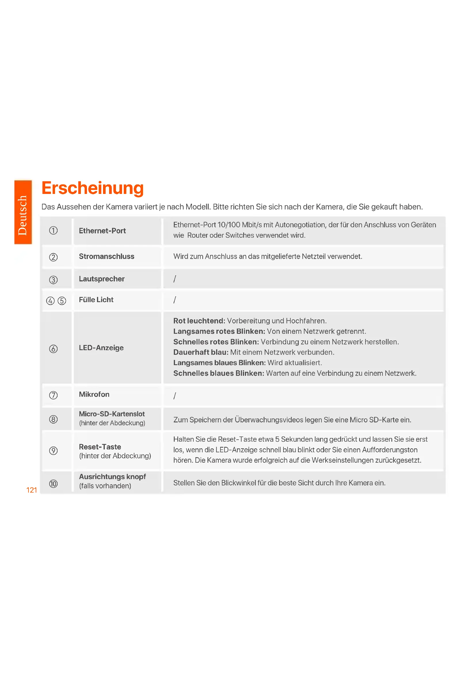 Wird zum Anschluss an das mitgelieferte Netzteil verwendet.Ethernet-Port 10/100Mbit/s mit Autonegotiation, der für den Anschluss von Geräten wie Router oder Switches verwendet wird.Rot leuchtend: Vorbereitung und Hochfahren.Langsames rotes Blinken: Von einem Netzwerk getrennt.Schnelles rotes Blinken: Verbindung zu einem Netzwerk herstellen.Dauerhaft blau: Mit einem Netzwerk verbunden.Langsames blaues Blinken: Wird aktualisiert.Schnelles blaues Blinken: Warten auf eine Verbindung zu einem Netzwerk.Zum Speichern der Überwachungsvideos legen Sie eine Micro SD-Karte ein.Halten Sie die Reset-Taste etwa 5 Sekunden lang gedrückt und lassen Sie sie erst los, wenn die LED-Anzeige schnell blau blinkt oder Sie einen Aufforderungston hören. Die Kamera wurde erfolgreich auf die Werkseinstellungen zurückgesetzt.Stellen Sie den Blickwinkel für die beste Sicht durch Ihre Kamera ein.Fülle LichtLED-AnzeigeMikrofonLautsprecher