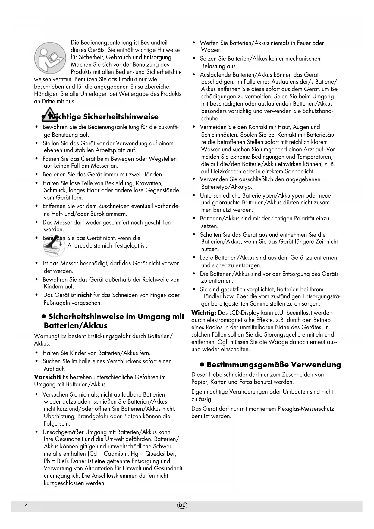 - Sie sind gesetzlich verpichtet, Batterien bei Ihrem Händler bzw. über die vom zuständigen Entsorgungsträ- ger bereitgestellten Sammelstellen zu entsorgen. Wichtig: Das LCD-Display kann u.U. beeinusst werden durch elektromagnetische Eekte, z.B. durch den Betrieb eines Radios in der unmittelbaren Nähe des Gerätes. In solchen Fällen sollten Sie die Störungsquelle ermitteln und entfernen. Ggf. müssen Sie die Waage danach erneut aus- und wieder einschalten. ▯ Bestimmungsgemäße Verwendung Dieser Hebelschneider darf nur zum Zuschneiden von Papier, Karten und Fotos benutzt werden. Eigenmächtige Veränderungen oder Umbauten sind nicht zulässig. Das Gerät darf nur mit montiertem Plexiglas-Messerschutz benutzt werden.3