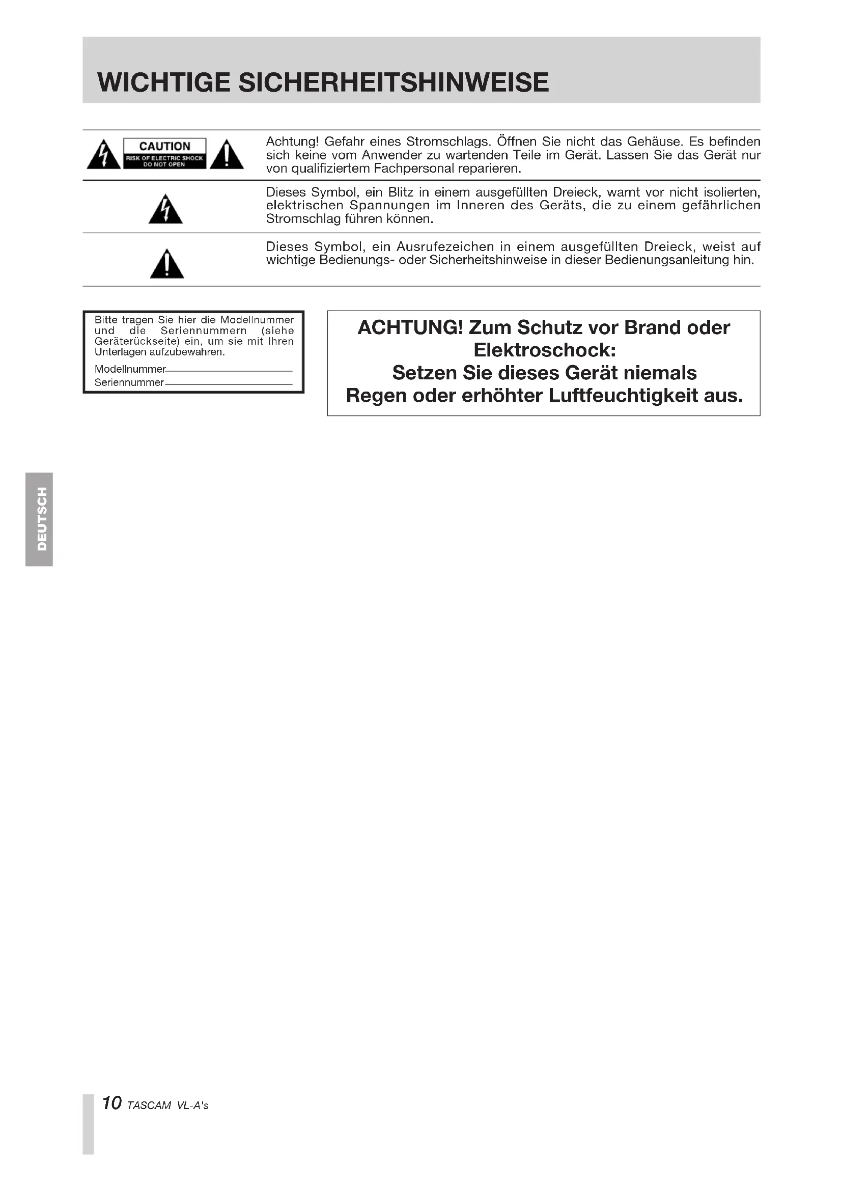 DEUTSCH WICHTIGE SICHERHEITSHINWEISE Dieses Symbol, ein Ausrufezeichen in einem ausgefüllten Dreieck, weist aufwichtige Bedienungs- oder Sicherheitshinweise in dieser Bedienungsanleitung hin.Dieses Symbol, ein Blitz in einem ausgefüllten Dreieck, warnt vor nicht isolierten,elektrischen Spannungen im Inneren des Geräts, die zu einem gefährlichenStromschlag führen können.Achtung! Gefahr eines Stromschlags. Öffnen Sie nicht das Gehäuse. Es befindensich keine vom Anwender zu wartenden Teile im Gerät. Lassen Sie das Gerät nurvon qualifiziertem Fachpersonal reparieren.Bitte tragen Sie hier die Modellnummerund die Seriennummern (sieheGeräterückseite) ein, um sie mit IhrenUnterlagen aufzubewahren.ModellnummerSeriennummer ACHTUNG! Zum Schutz vor Brand oder Elektroschock: Setzen Sie dieses Gerät niemals Regen oder erhöhter Luftfeuchtigkeit aus.TASCAM VL-A's 11