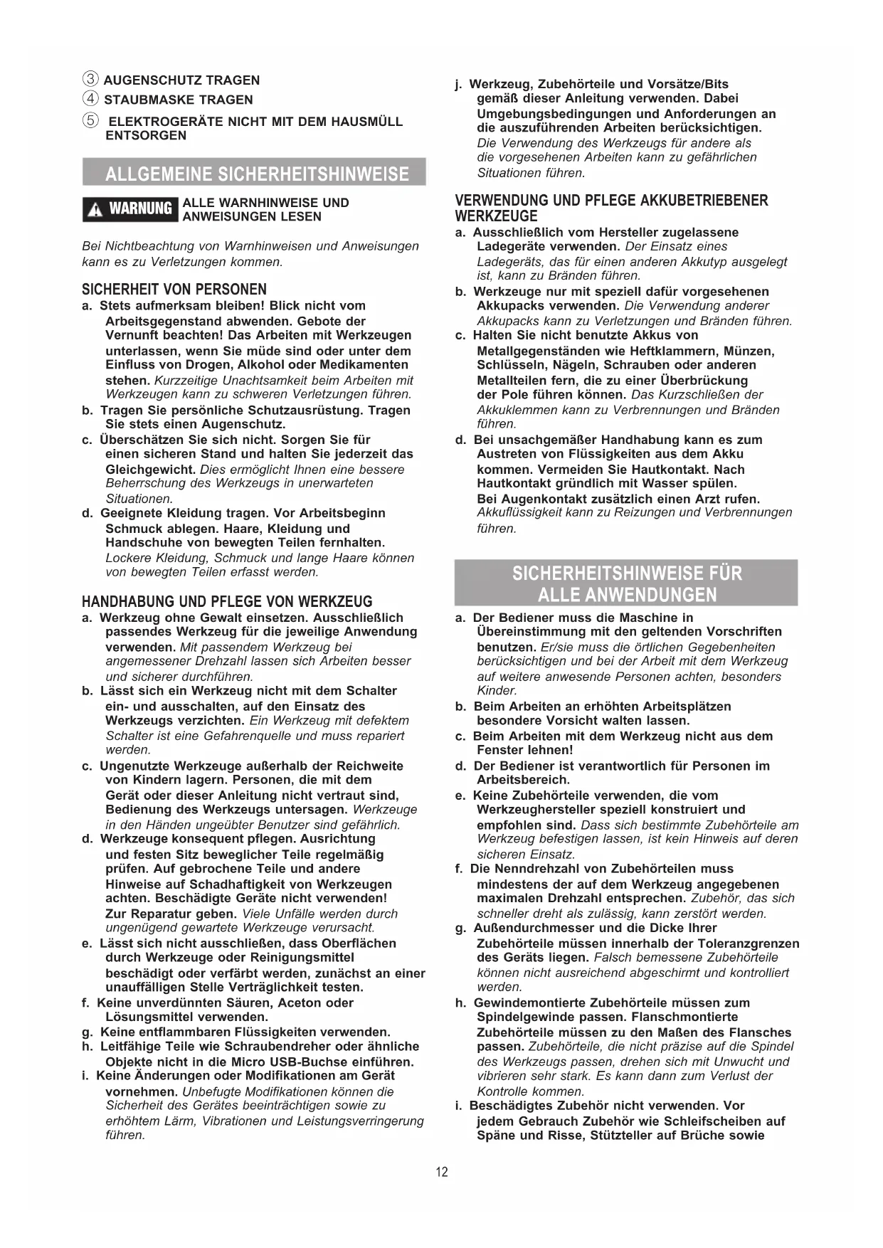 a. Werkzeug ohne Gewalt einsetzen. Ausschließlich passendes Werkzeug für die jeweilige Anwendung verwenden. Mit passendem Werkzeug bei angemessener Drehzahl lassen sich Arbeiten besser und sicherer durchführen.b. Lässt sich ein Werkzeug nicht mit dem Schalter ein- und ausschalten, auf den Einsatz des Werkzeugs verzichten. Ein Werkzeug mit defektem Schalter ist eine Gefahrenquelle und muss repariert werden.c. Ungenutzte Werkzeuge außerhalb der Reichweite von Kindern lagern. Personen, die mit dem Gerät oder dieser Anleitung nicht vertraut sind, Bedienung des Werkzeugs untersagen. Werkzeuge in den Händen ungeübter Benutzer sind gefährlich.d. Werkzeuge konsequent pegen. Ausrichtung und festen Sitz beweglicher Teile regelmäßig prüfen. Auf gebrochene Teile und andere Hinweise auf Schadhaftigkeit von Werkzeugen achten. Beschädigte Geräte nicht verwenden! Zur Reparatur geben. Viele Unfälle werden durch ungenügend gewartete Werkzeuge verursacht.e. Lässt sich nicht ausschließen, dass Oberächen durch Werkzeuge oder Reinigungsmittel beschädigt oder verfärbt werden, zunächst an einer unauffälligen Stelle Verträglichkeit testen.f. Keine unverdünnten Säuren, Aceton oder Lösungsmittel verwenden.g. Keine entammbaren Flüssigkeiten verwenden.h. Leitfähige Teile wie Schraubendreher oder ähnliche Objekte nicht in die Micro USB-Buchse einführen.i. Keine Änderungen oder Modikationen am Gerät vornehmen. Unbefugte Modikationen können die Sicherheit des Gerätes beeinträchtigen sowie zu erhöhtem Lärm, Vibrationen und Leistungsverringerung führen.j. Werkzeug, Zubehörteile und Vorsätze/Bits gemäß dieser Anleitung verwenden. Dabei Umgebungsbedingungen und Anforderungen an die auszuführenden Arbeiten berücksichtigen. Die Verwendung des Werkzeugs für andere als die vorgesehenen Arbeiten kann zu gefährlichen Situationen führen.