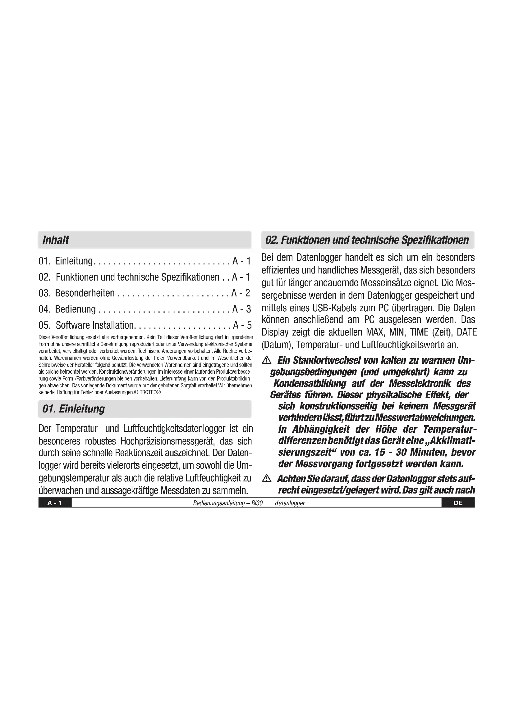 DES RATES vom 27. Januar 2003 über Elek- tro- und Elektronik-Altgeräte – einer fachgerechten Ent- sorgung zugeführt werden. Bitte entsorgen Sie dieses Gerät am Ende seiner Verwendung entsprechend der geltenden gesetzlichen Bestimmungen. TRO-TR-BA-BL30-HS-002-INT - Kopie.indd 11 08.09.2014 10:19:11EN opera ting instr uctions - clima te da t a logger B l 30 B - 1 Contents 1.Introduction ............................B - 1